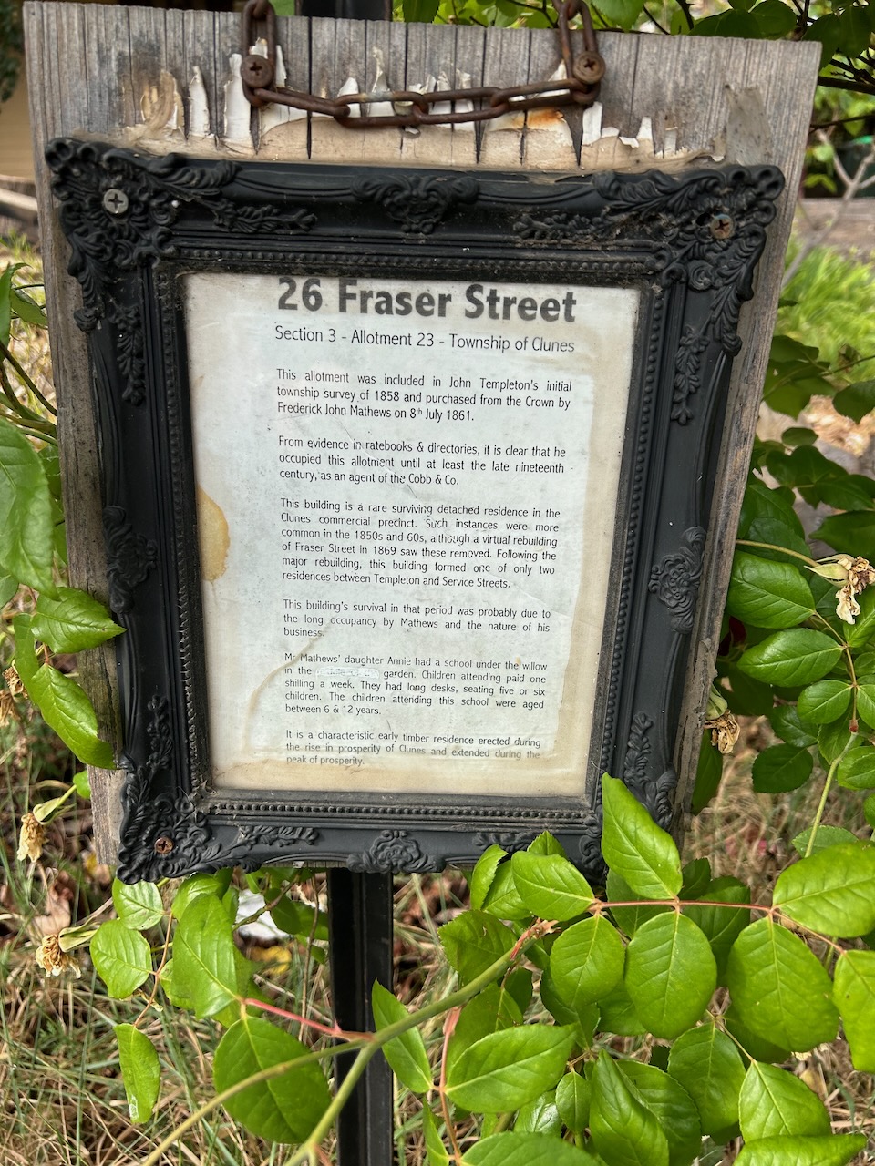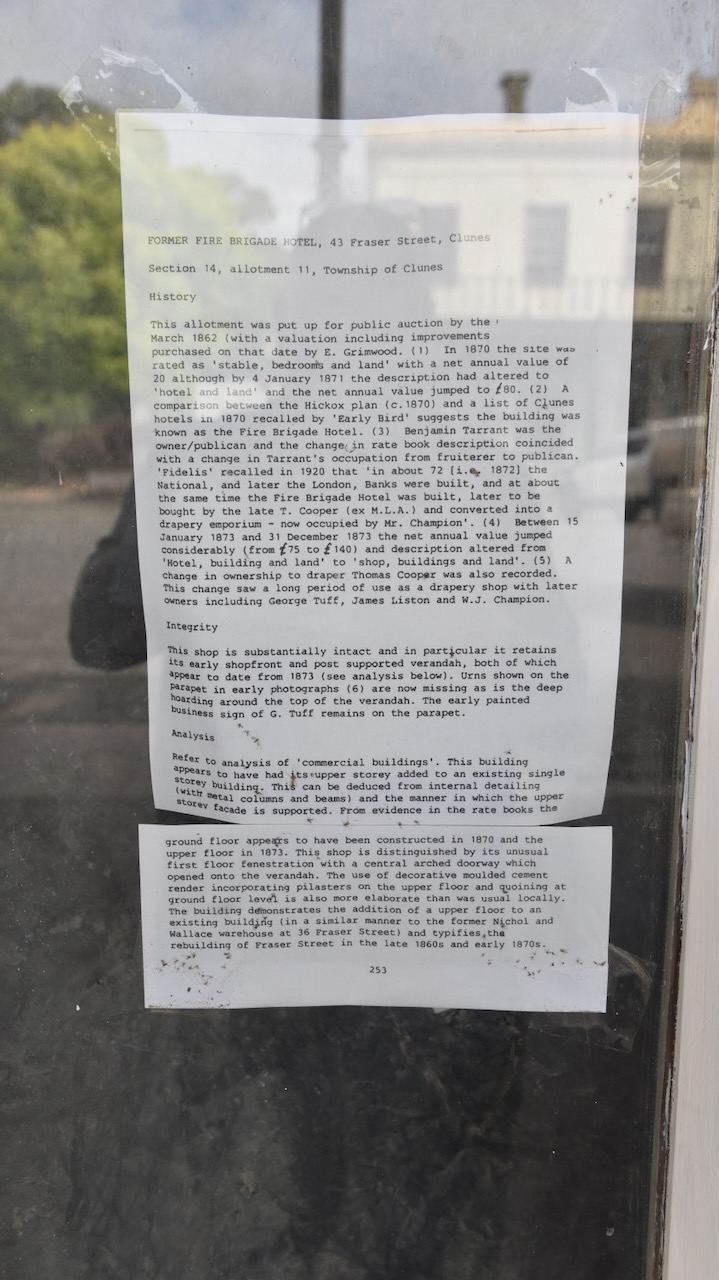 Section 3-Allotment 23-Township of CLunes (26 Fraser Street) was included in the initial Clunes township survey of 1858. The building served as an agent of the Cobb & Co until the late 1800s.