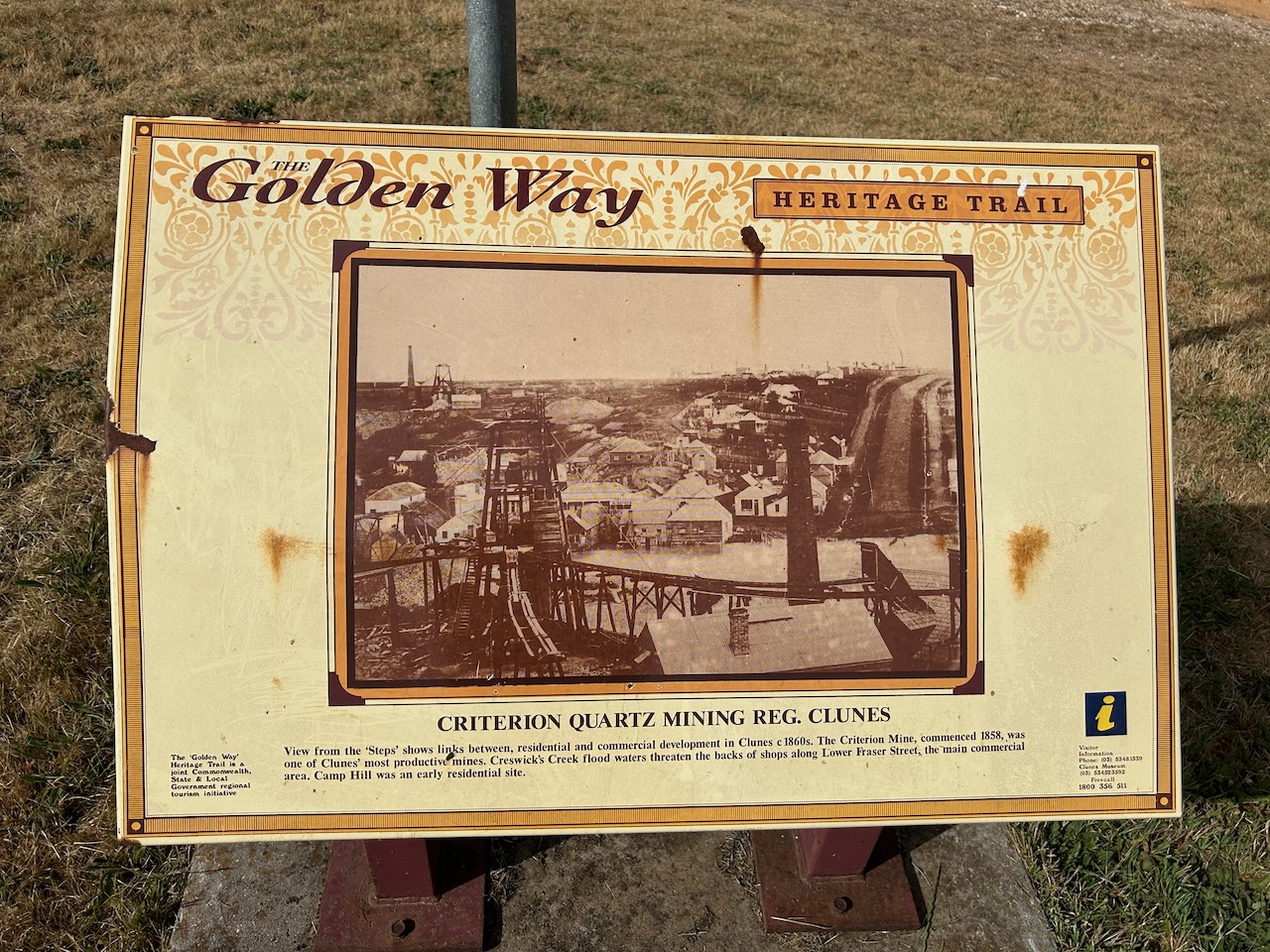 In 1851 one of Victoria’s first official gold discoveries occurred at Clunes and this resulted in a gold rush for alluvial gold along Creswick Creek. This was followed by a larger operation to extract gold from the quartz reefs mear Clunes. (Victorian Places 2024)