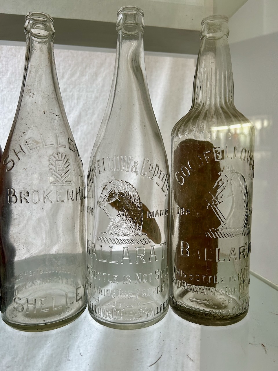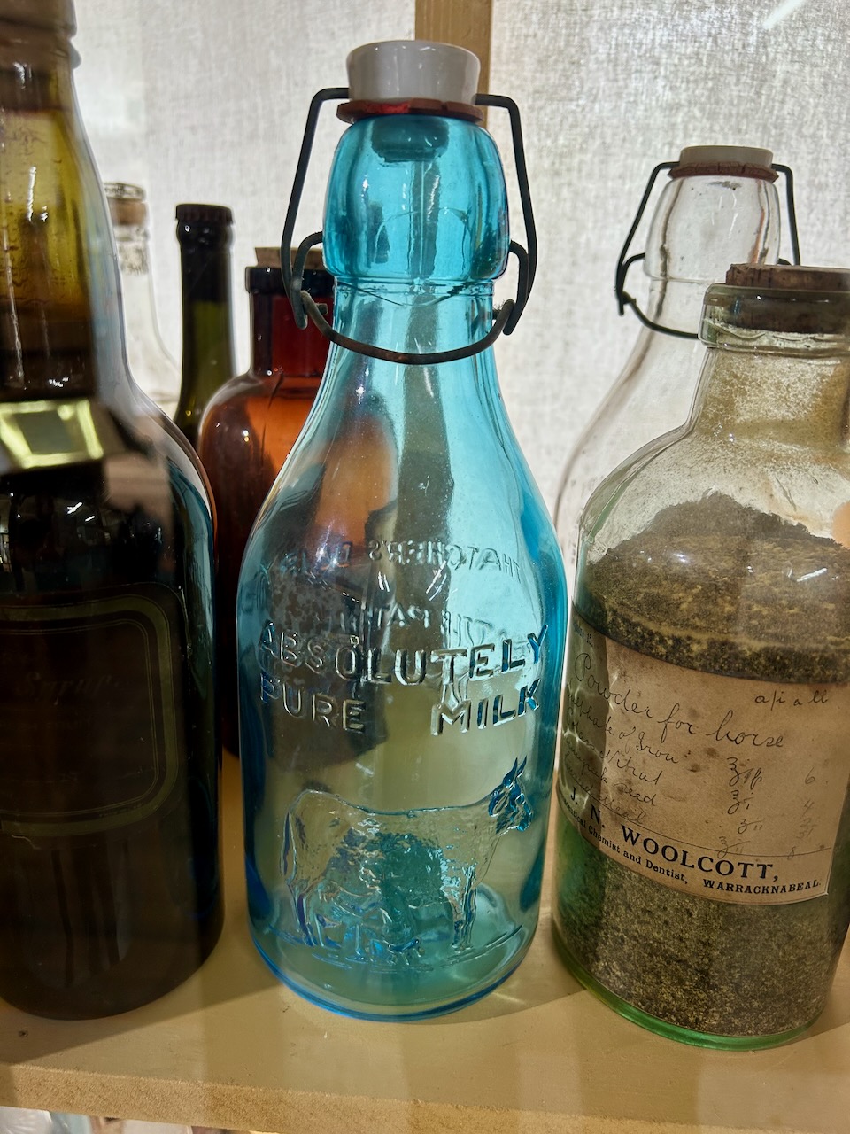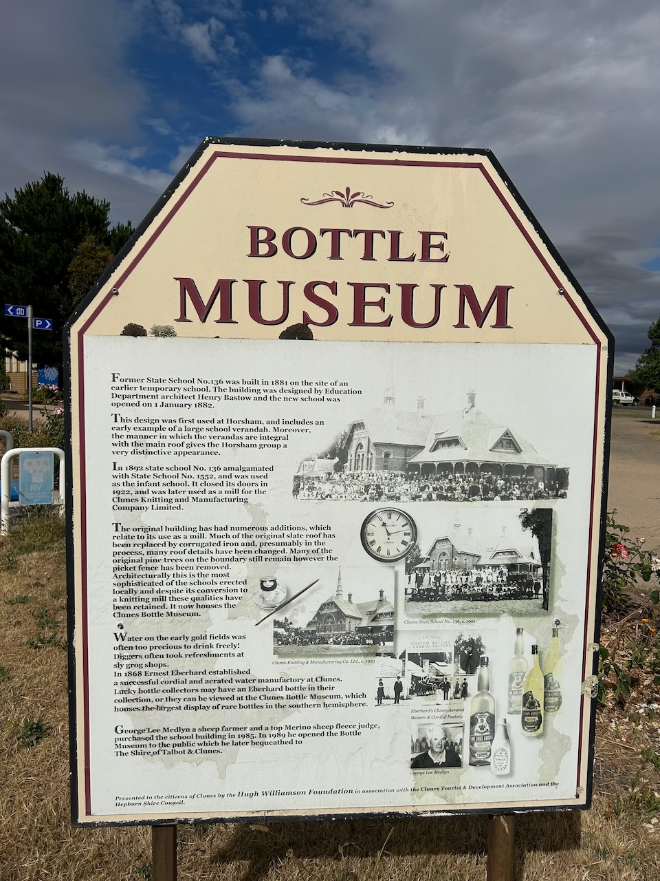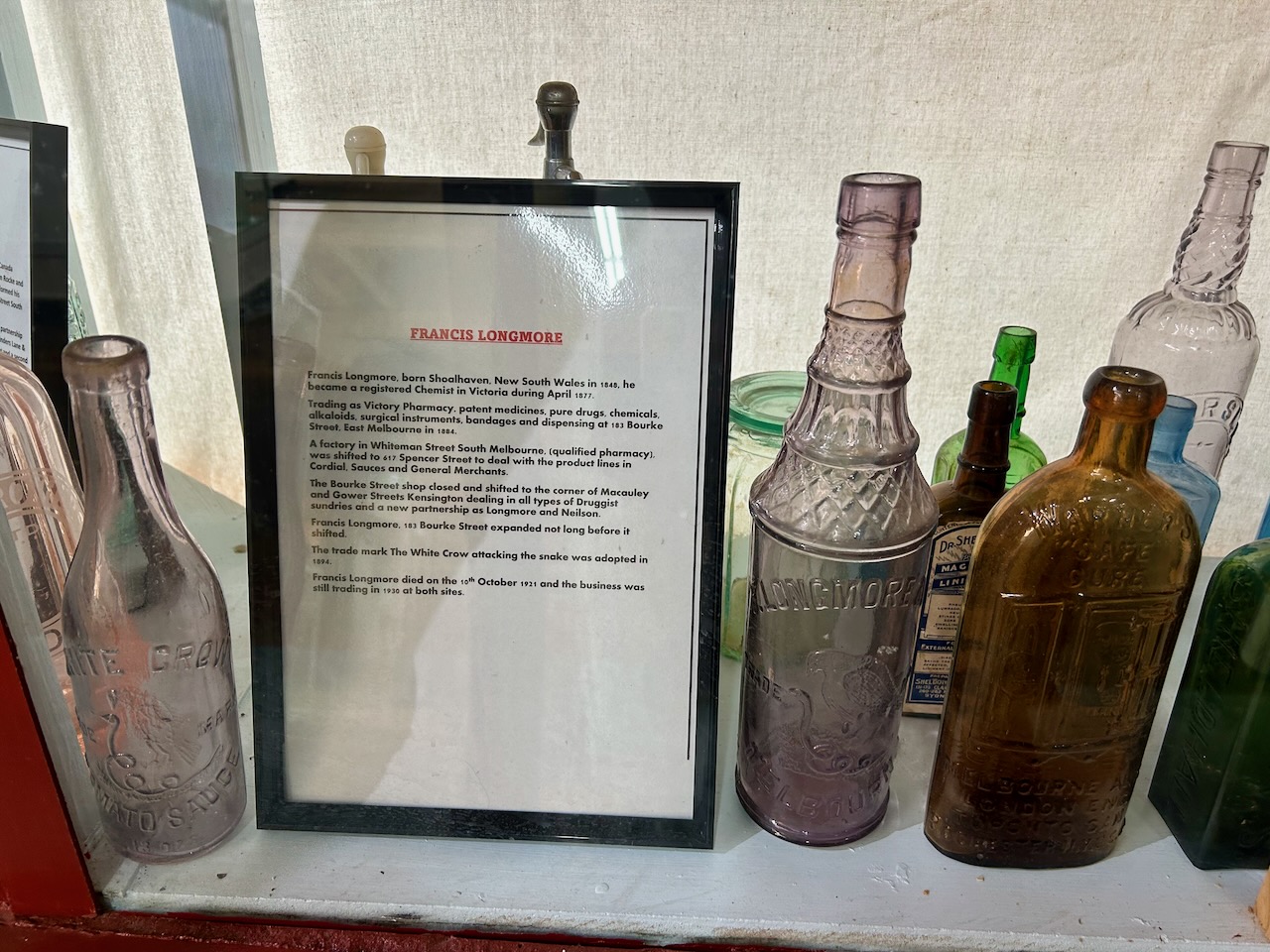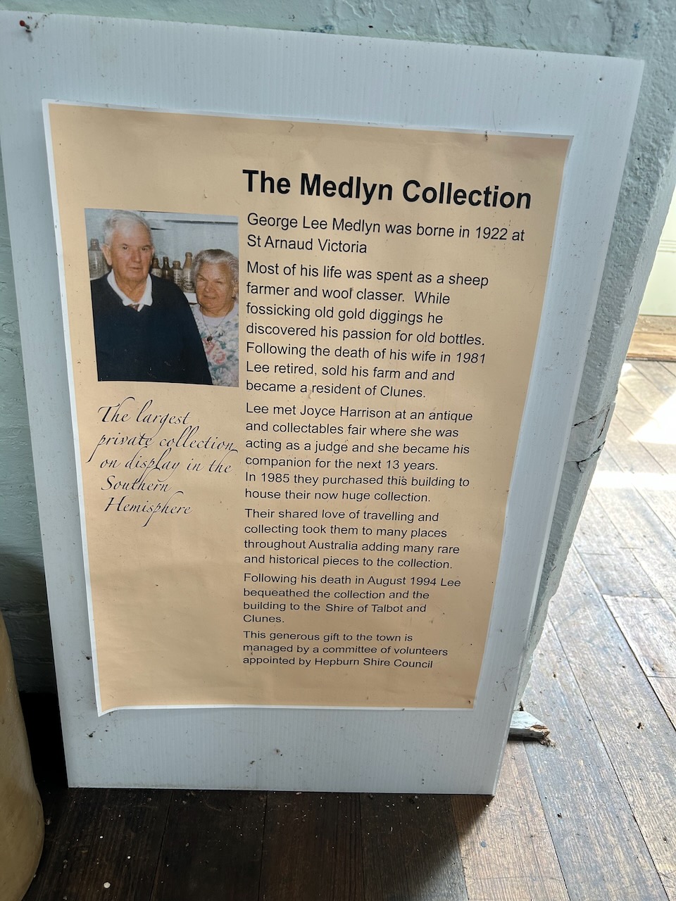 After leaving the Clunes Museum, we visited the Lee Medlyn Home of Bottles in Clunes. This amazing museum contains over 6,000 old and historical bottles that date from 1,500 AD to present times. The bottles include those used for beer, wine, spirit, aerated waters, preserves, condiments, ginger beer, chemist and drug companies. (Clunes Museum 2024)