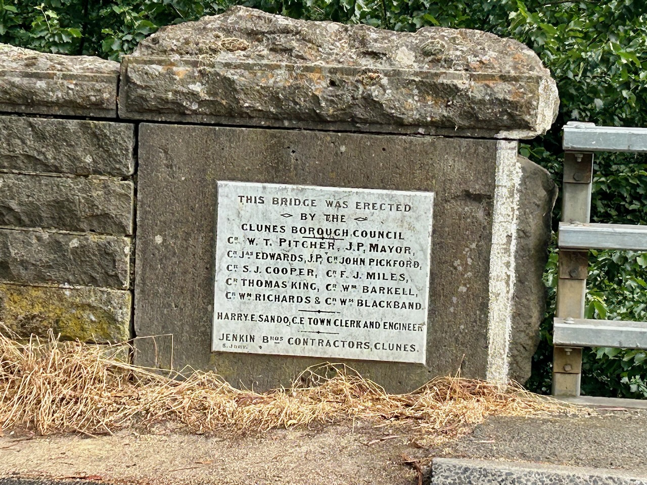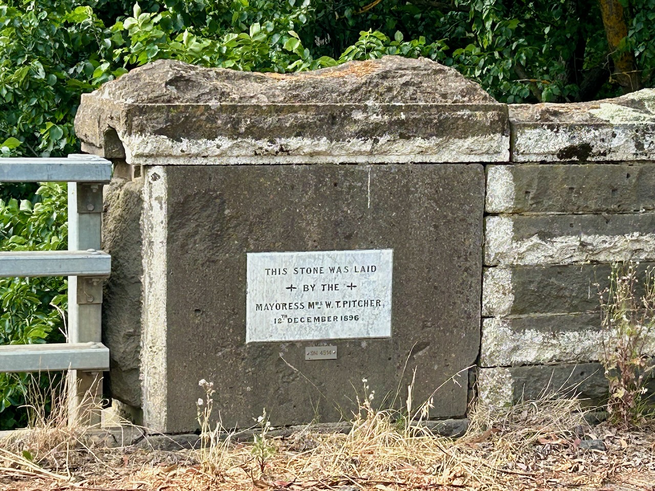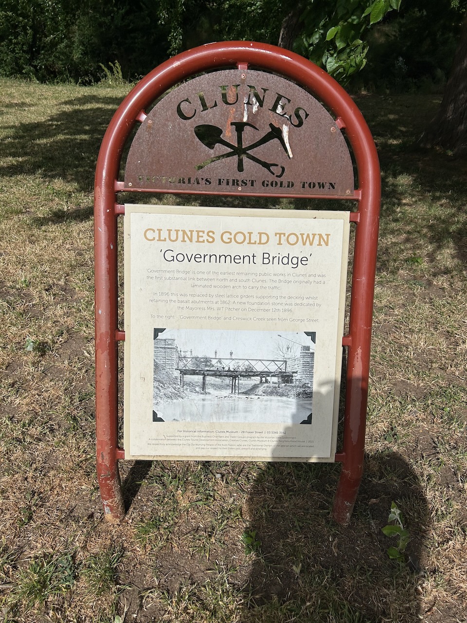 Government Bridge is one of the earliest remaining public workds in CLunes and was the first substantial link between north and south Clunes. The bridge originally had a laminated wooden arch to carry the traffic. In 1896 this was replaced by steel lattice girders supporting the decking whilst retaining th basalt abutments at 1862. A new foundation stone was dedicated by the Mayoress Mrs W.T. Pitcher on the 12th day of December 1896.