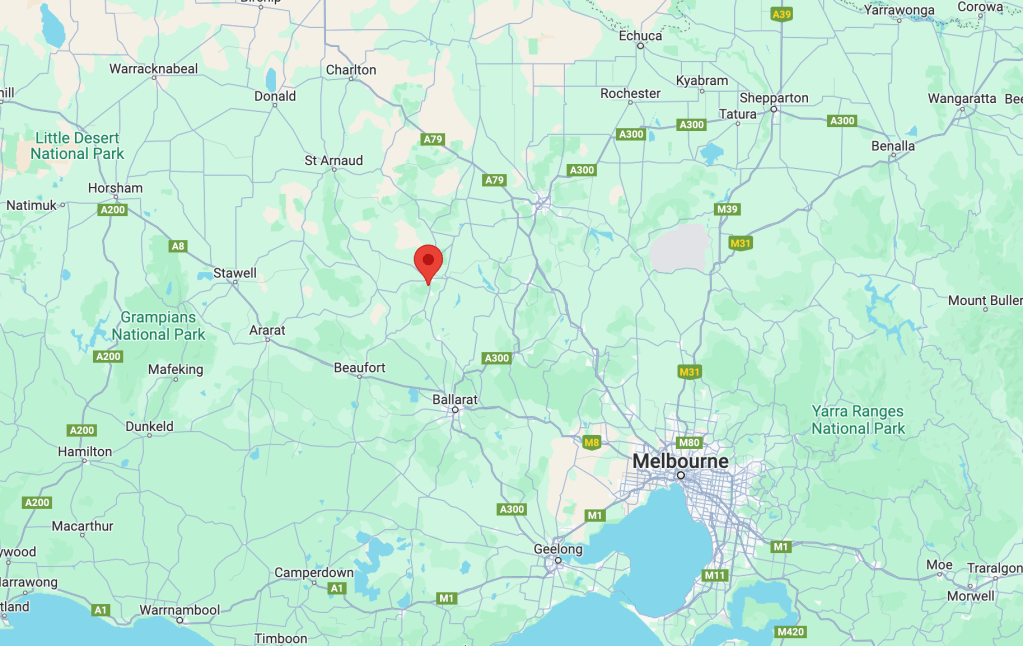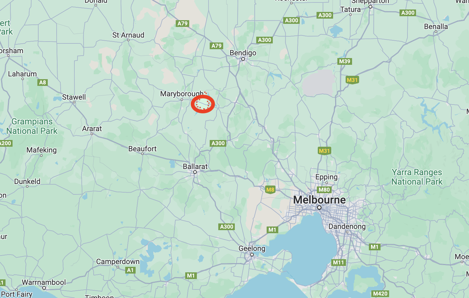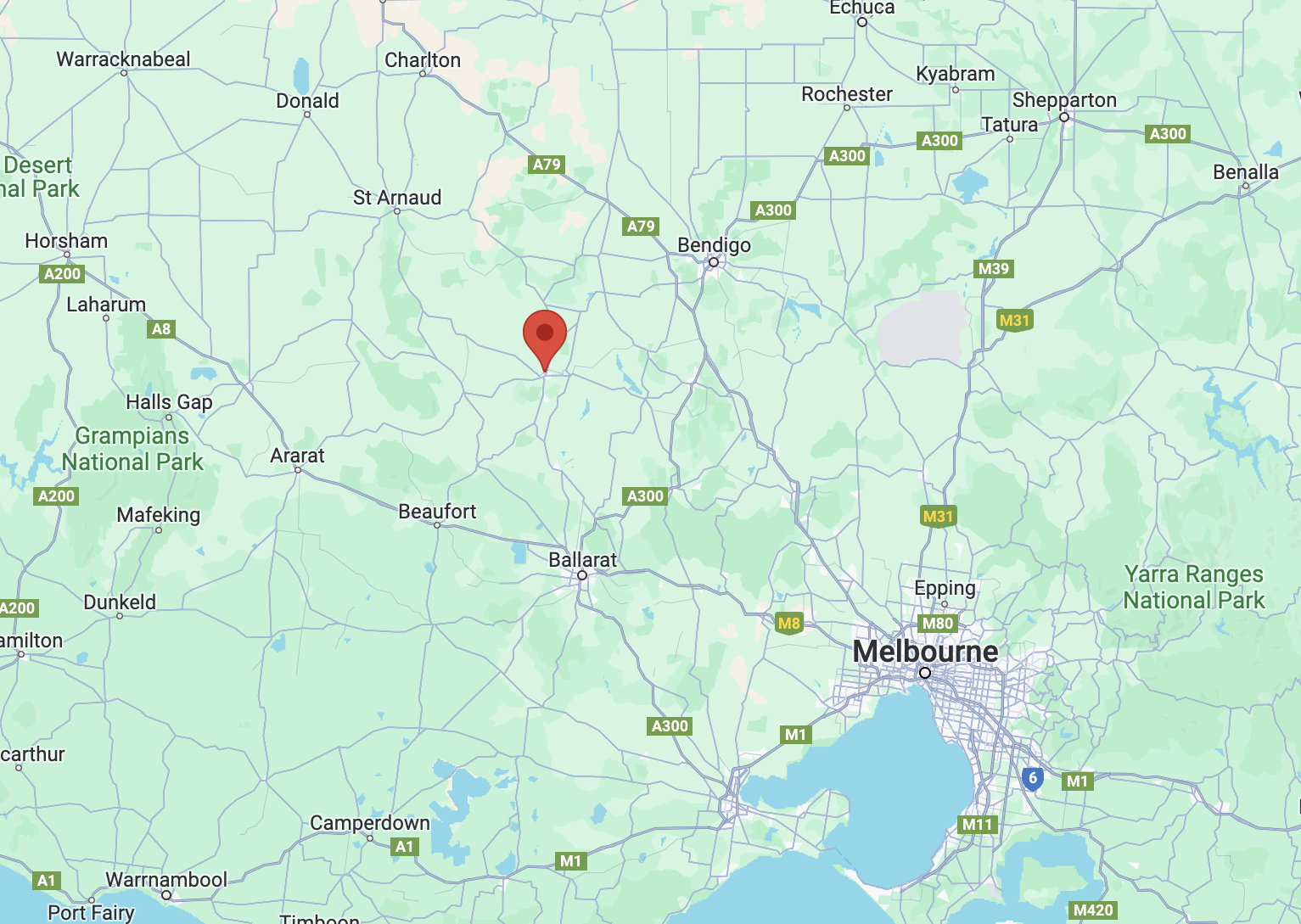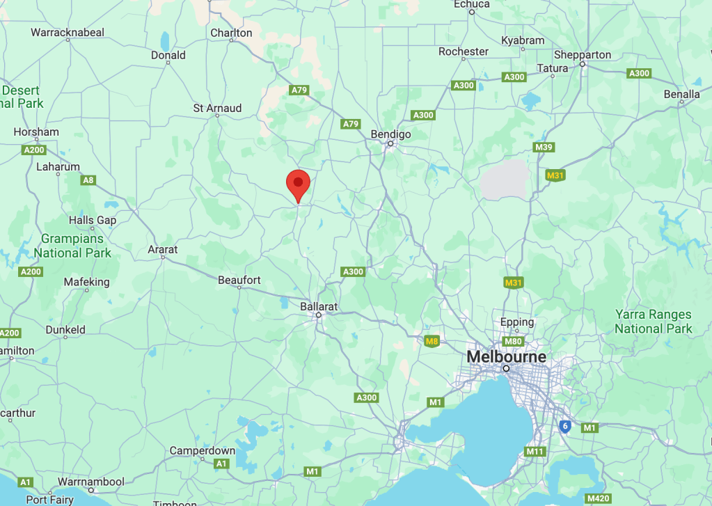 Above:- Map showing the location of Bealiba in Victoria. Map c/o Google Maps.