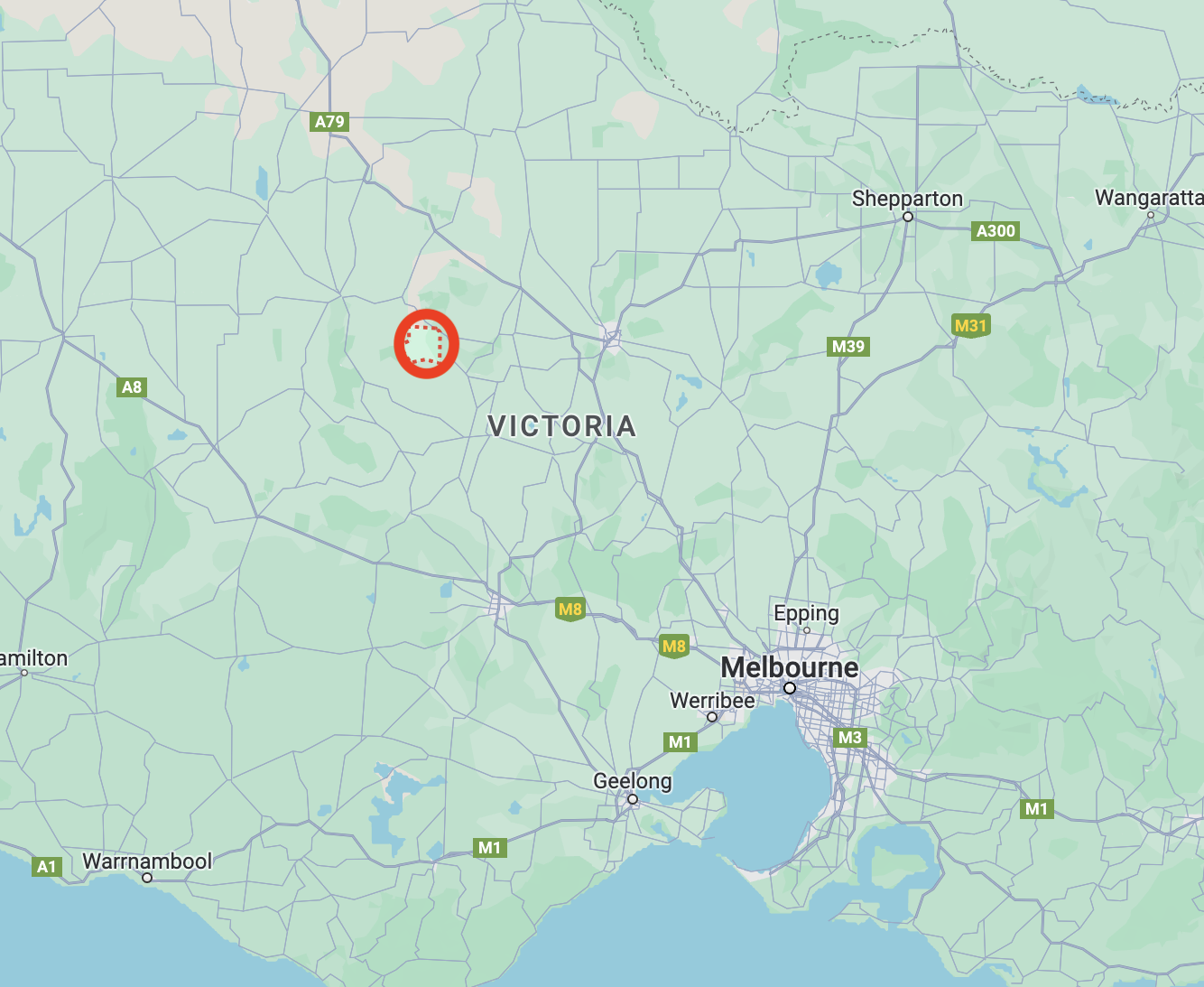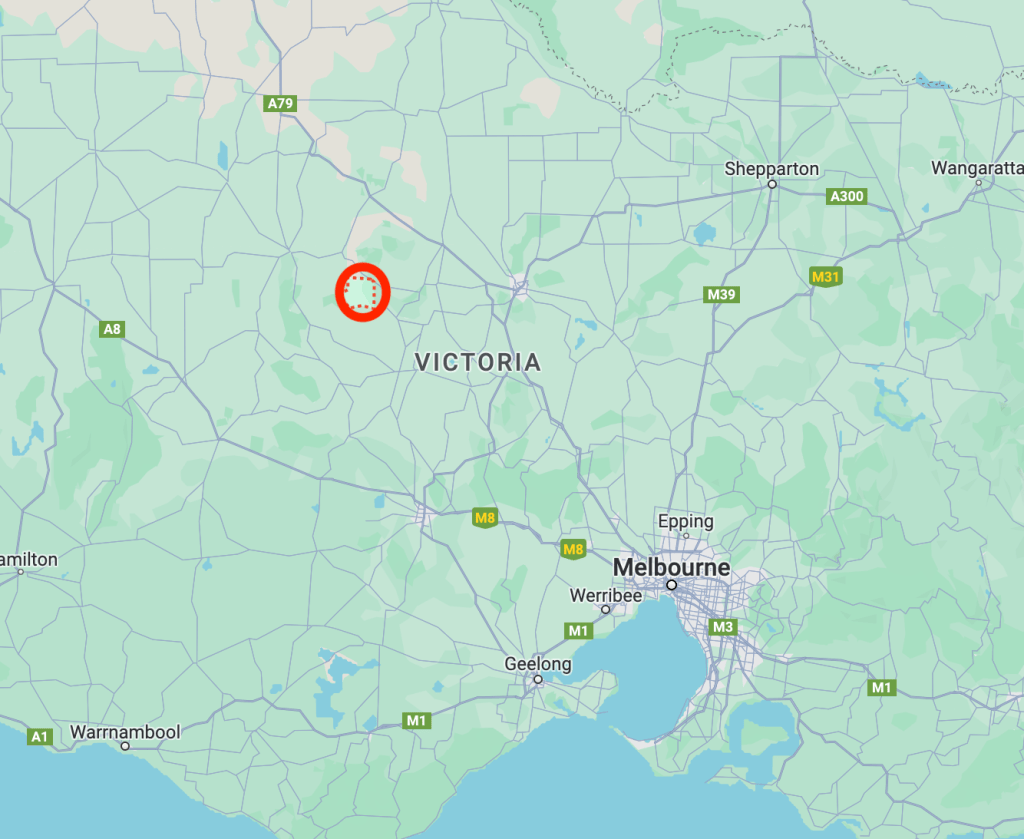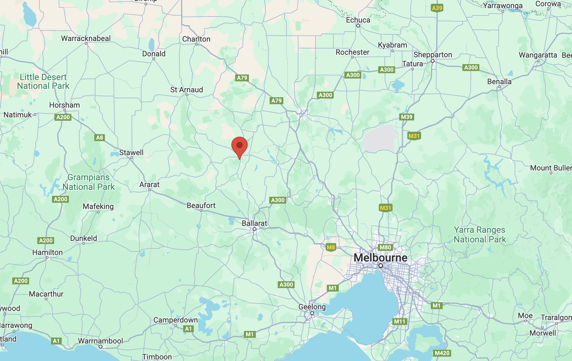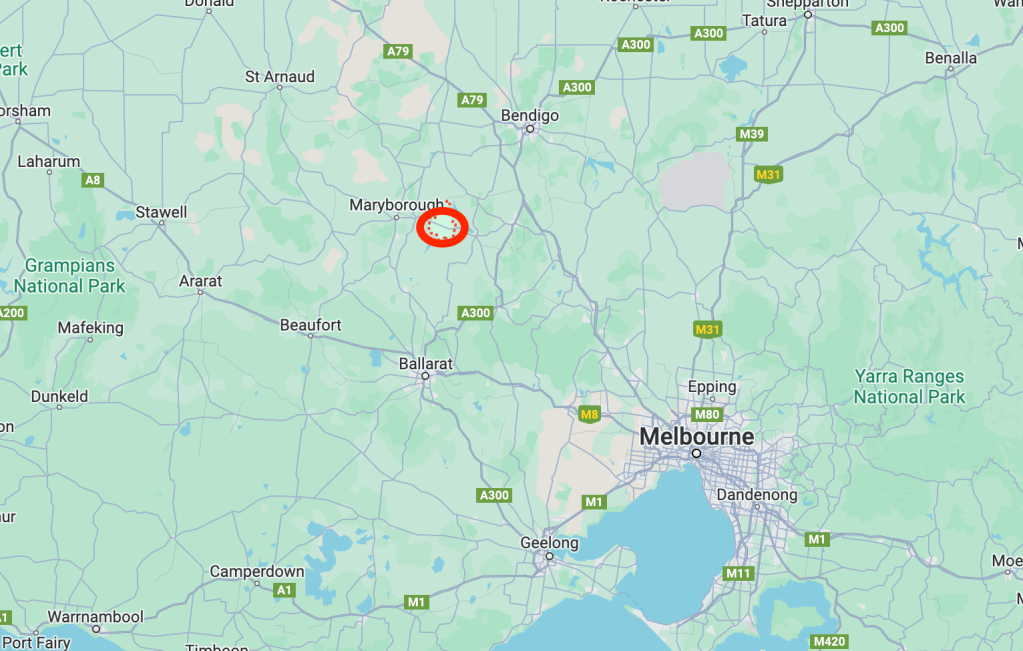 Above:- Map showing the location of Bealiba in Victoria. Map c/o Google Maps.