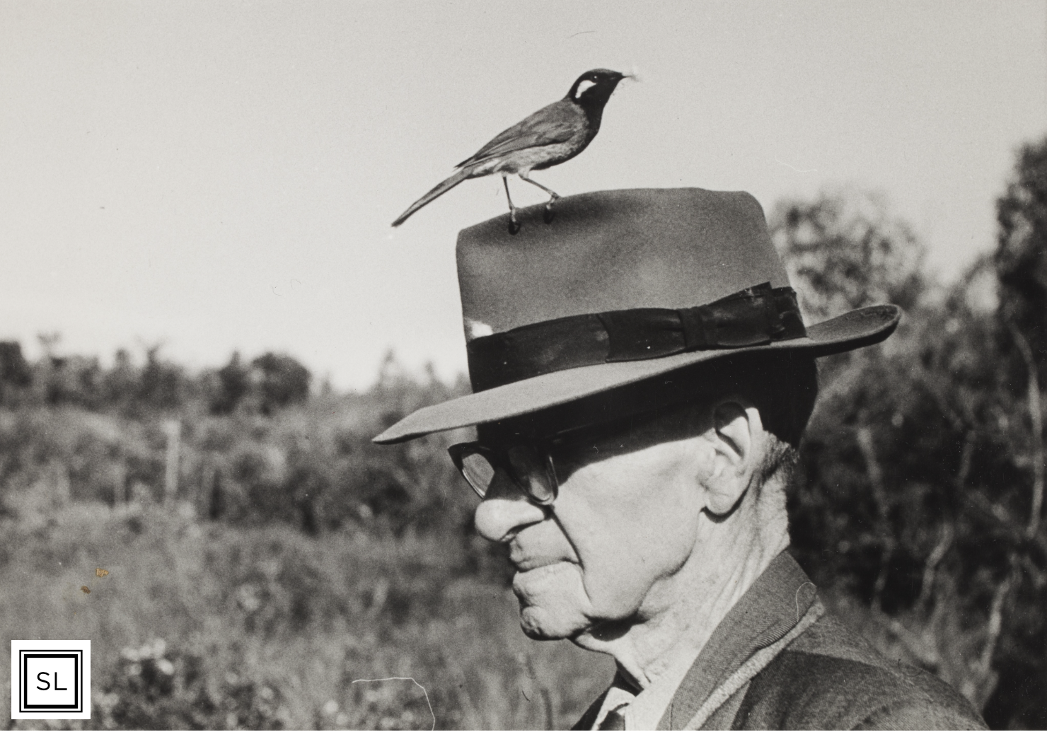 Above:- Alec Chisolm in Kuring-gai Chase National Park, July 1966, with a White=eared Honeyeater on his hat. Image c/o State Library New South Wales.