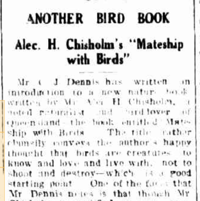 During his life, he was the author of hundreds of ornithological and natural history articles. When various dignitaries went bird watching, Chisholm was called upon to act as a guide. He died on the 10th day of July 1977 in Cremorne Point. (Aust Dict Biography 2024)