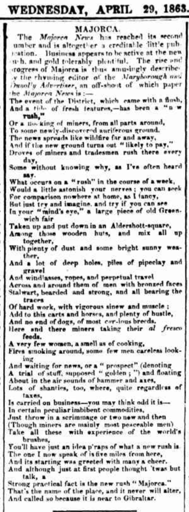 Majorca was the last of the large goldfields to be discovered in the Maryborough region. The Gibraltar diggings were found in 1858, followed by the Majorca gold field in 1863 when Charles Bannister and William Vowles (b. 1825. d. 1871) found gold on the plains east of McCallum’s Creek, northeast of Majorca in March 1863. This drew thousands of miners to the district. It is believed the name was given to the diggings due to the proximity of the Mediterranian island of Majorca to Gibraltar. (Victorian Places 2024)
