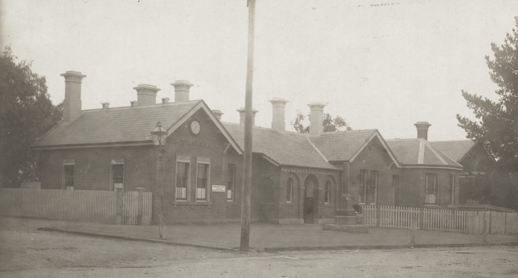 The Clunes Post and Telegraph Office was constructed in 1879 by Messrs Lewis and Roberts at a cost of £4099. The kitchen outbuildings were constructed by Charles Morgan & Co for an additional £279. It replaced a smaller Post office building that was built in 1861. (Heritage Council Victoria 2024)