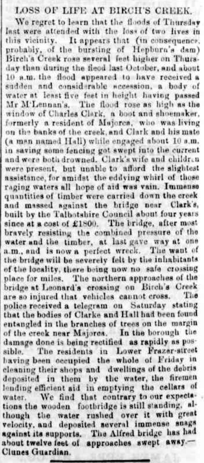 The Mount Alexander Mail reported the loss of two lives at Birch’s Creek.