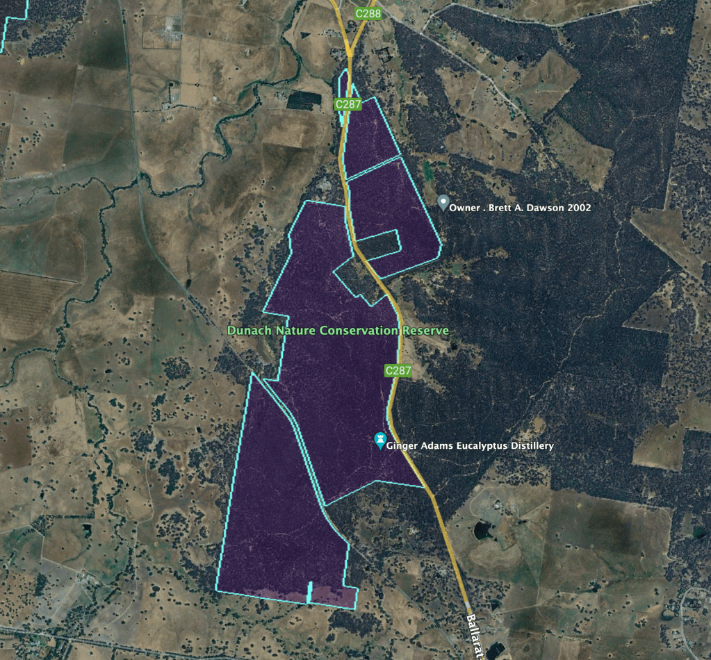 After leaving the bottle museum, Marija and I activated the Dunach Nature Conservation Reserve. The park is located on the southwestern side of Ballarat-Maryborough Road, about 10 km northwest of Clunes.