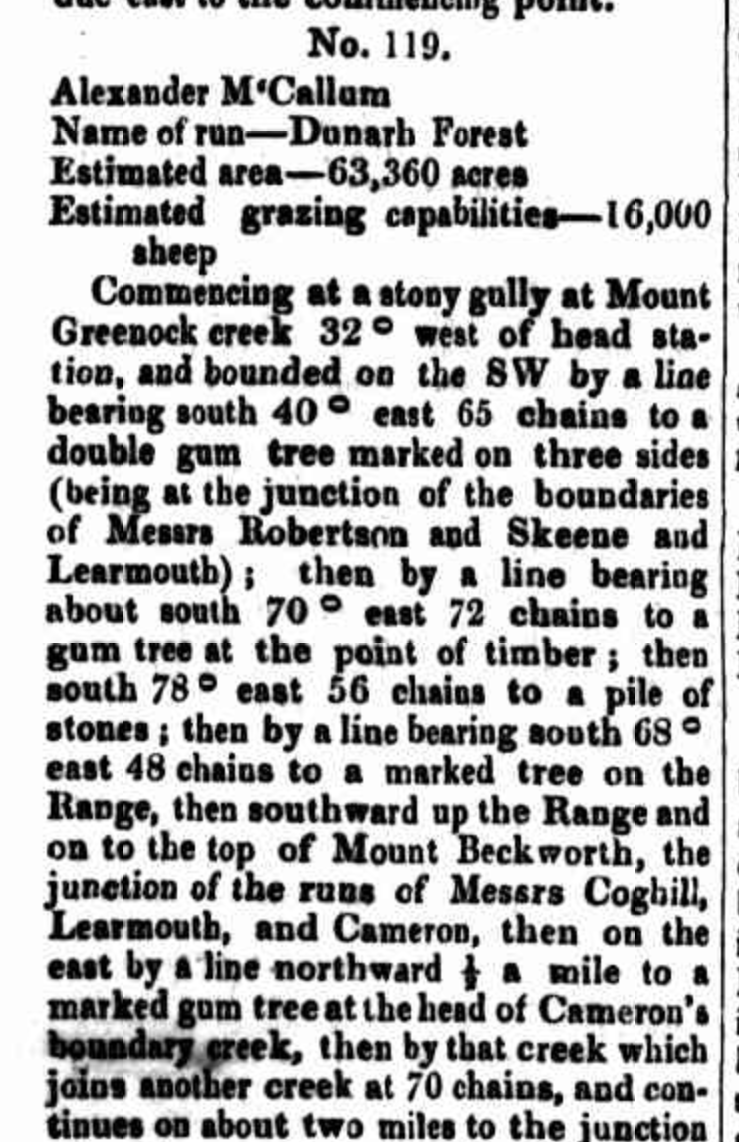 From 1841, Mount Greenock formed part of Alexander MacCallum’s Dunach Forest pastoral run, sometimes referred to as the Mount Greenock run. (Goldfields Guide 2024) (Victorian Goldfields Project 1998)