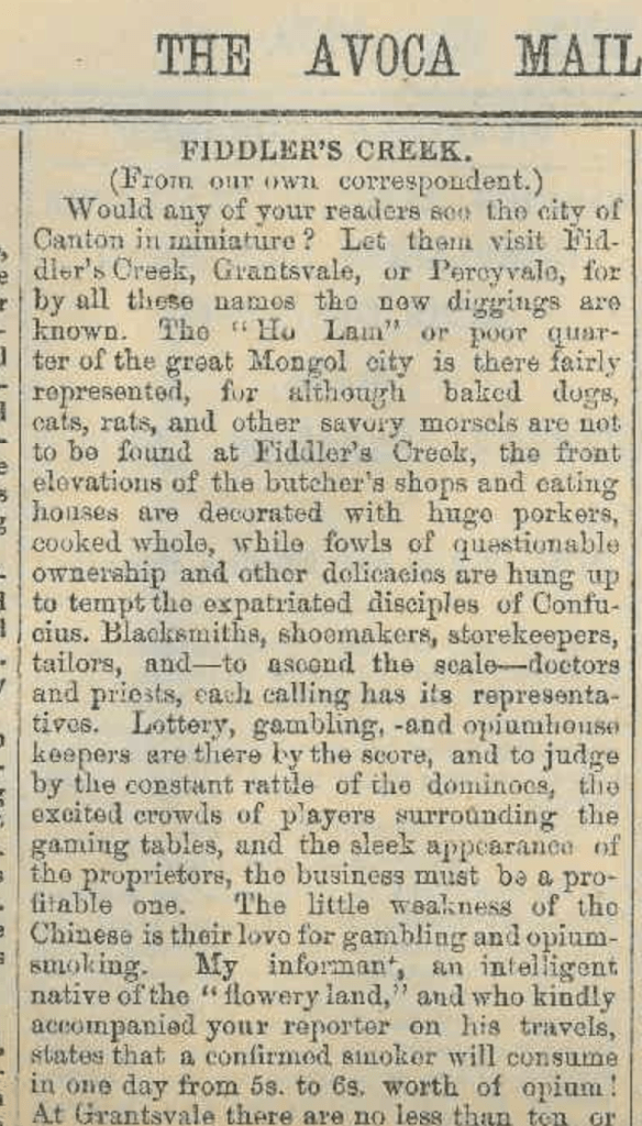 “Would any of your readers see the city of Canton in miniature? Let them visit Fiddler’s Creek, Grantsvale, or Percy vale, for by all these names the new diggings are known. The “Ho Lam” or poor quarter of the great Mongol city is there fairly represented, for although baked dogs, cats, rats, and other savory morsels are not to be found at Fiddler’s Creek, the front elevations of the butcher’s shops and eating houses are decorated with huge porkers, cooked whole, while fowls of questionable ownership and other delicacies are hung up to tempt the expatriated disciples of Confucius.”