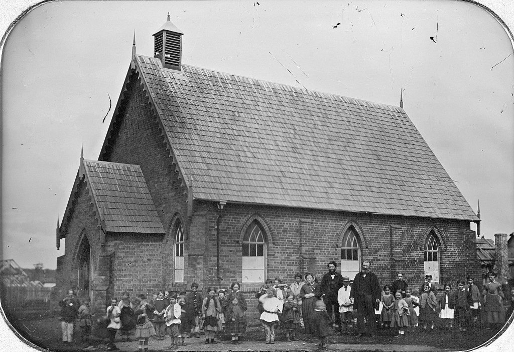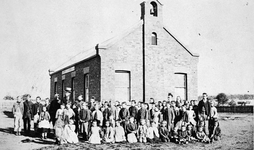 Above:- Students and teachers outside the Mount Moliagul Common School, 1872. Image c/o Museums Victoria.