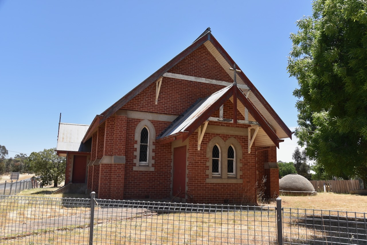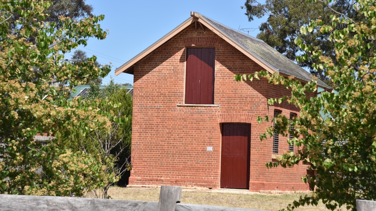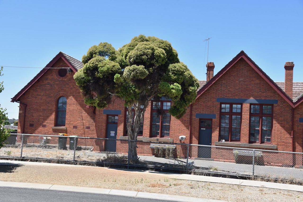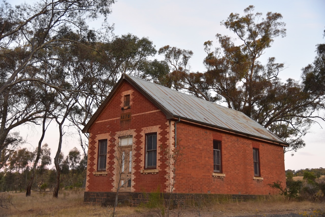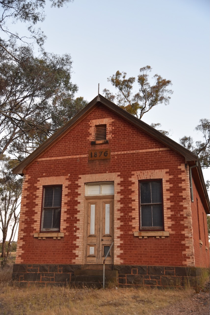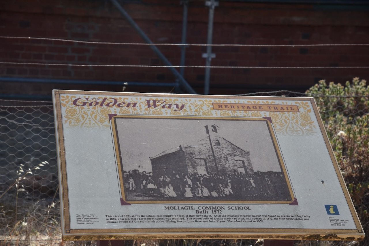 The Moliagul Common School was built in 1862 of locally made red brick. The first Head Teacher was Thomas Flynn. The school closed in 1970. It was under restoration during our visit.