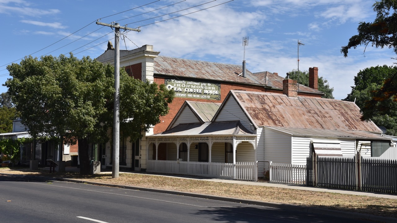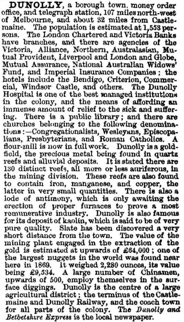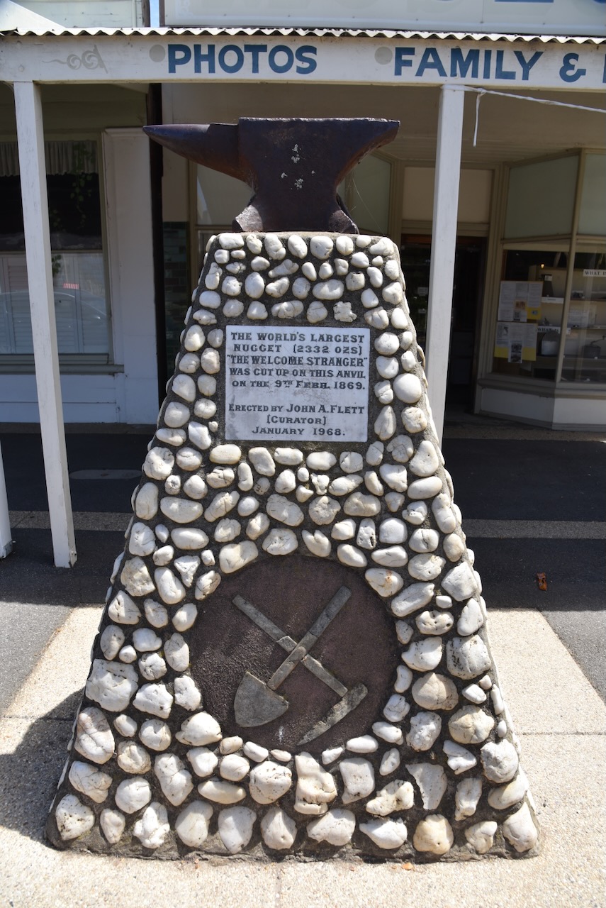 The 69 kg (2,316 ounces) Welcome Stranger nugget was the world’s largest known gold nugget. It was conveyed to Dunolly on a spring cart belonging to Edward Endey. A friend and neighbour of Deason and Oates, Walter Brown, was asked to go into the London Chartered Bank and ask the teller that they were paying for gold by the ‘hundred weight’. The nugget was then brought into the bank and presented to the Manager. The nugget was too, large to be weighed on the bank scales, so Archie Walls, the local blacksmith broke the nugget into pieces on an anvil. At the time, the Welcome Stranger was valued at £9,553. The equivalent today is about $10 million. (Aussie Towns 2024)