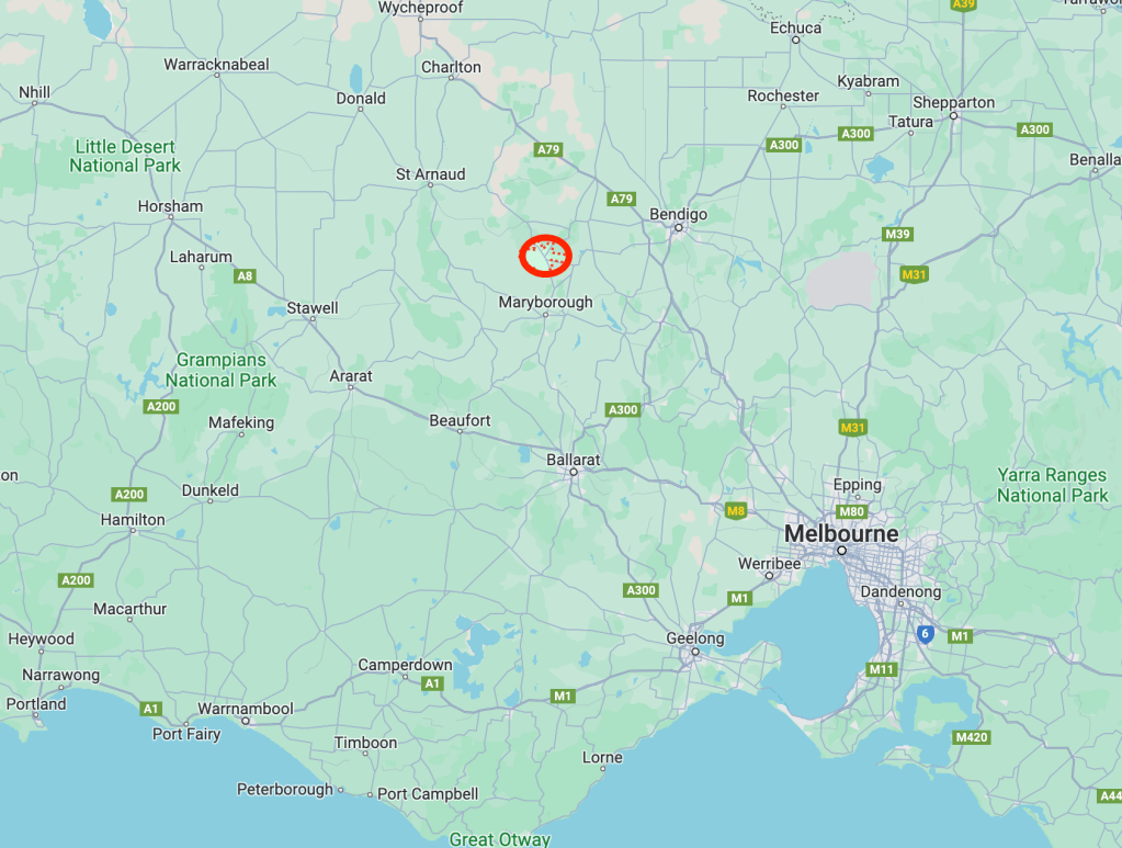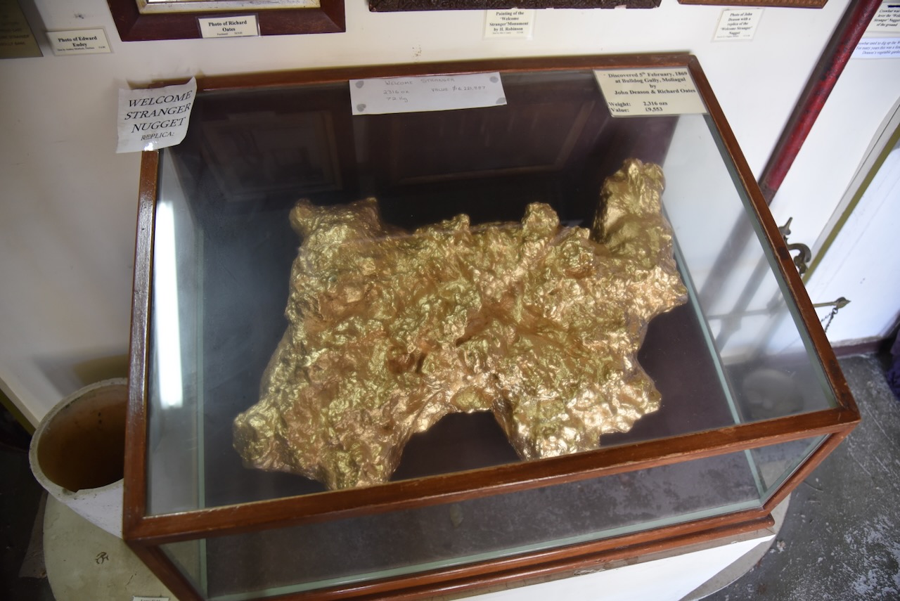 Gold was discovered at Queens Gully near Moliagul in late 1852 and was one of the earliest finds of gold in the Dunolly district. Several notable nuggets were located. The most famous was the Welcome Stranger in 1869 weighing in at a gross weight of 2,520 ounces (about 70 kilograms). More about the Welcome Stranger a little later in this post. (Aussie Towns 2024) (Victorian Places 2024)