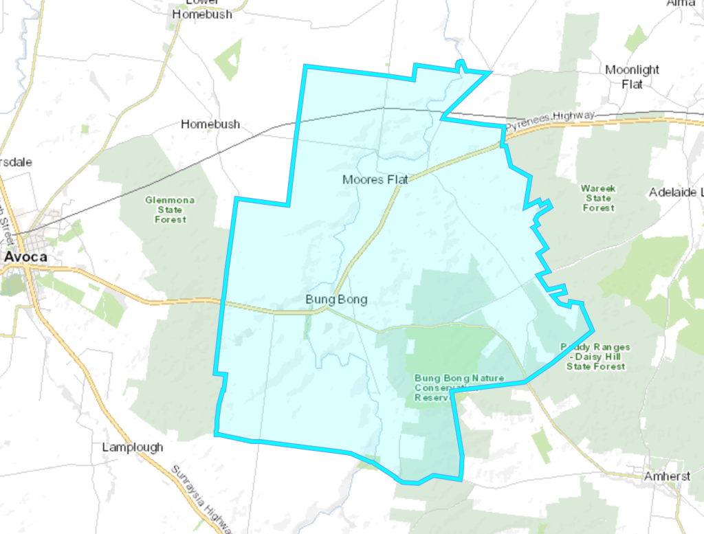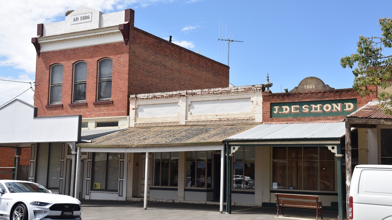 The first survey of the Moliagul township was conducted in 1859 by Henry Morris. The surveyed government site was on a hill to the east of the present main street. Settlers who had built premises on the flat near the creek, refused to purchase the sites on the hill when they came up for sale. In 1862 Dunolly Surveor Phillip Chauncey offered both sites for sale. The first sale of land at Moliagul took place on the 5th day of September 1862. In 1869 a school was opened and in 1863 this was moved to a Primitive Methodist chapel. It was rebuilt on a further site in 1872. The school’s head teacher was Thomas Flynn, the father of John Flynn, the founder of the Australian Inland Mission and Royal Flying Doctor Service. (Bannear 1980) (Victorian Places 2024)