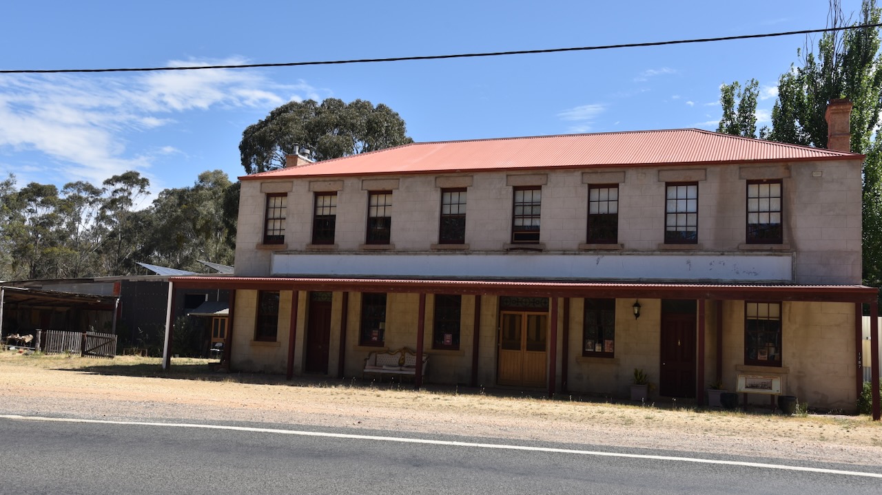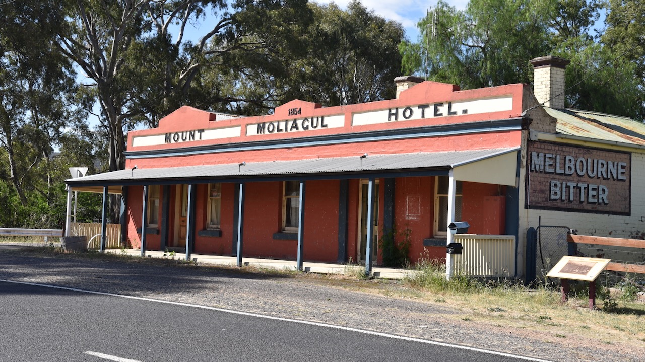 Not much remains at Moliagul which was once a thriving gold mining town. One of the surviving buildings in the town is the old Mount Moliagul Hotel built in 1861. The current building is the second hotel on this site. The original hotel was licenced in 1854 and was burnt down. (Aussie Towns 2024)