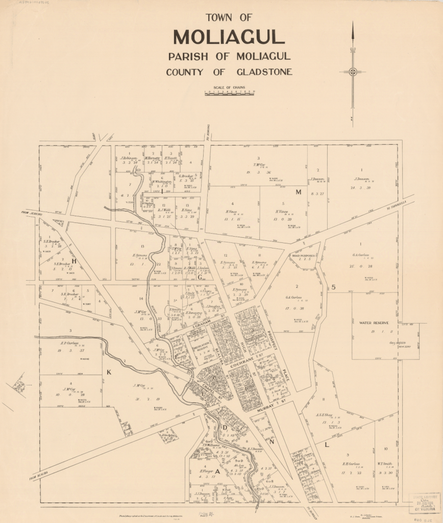 Above:- A map of the town of Moliagul. Image c/o State Library Victoria.