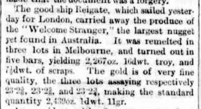 Within a few days of the discovery of the Welcome Stranger, the melted-down gold ingots were conveyed to Melbourne and on Sunday the 21st day of February 1869 they were shipped to the Bank of England aboard the steamship Reigate. (Gold Net Australia 2000)