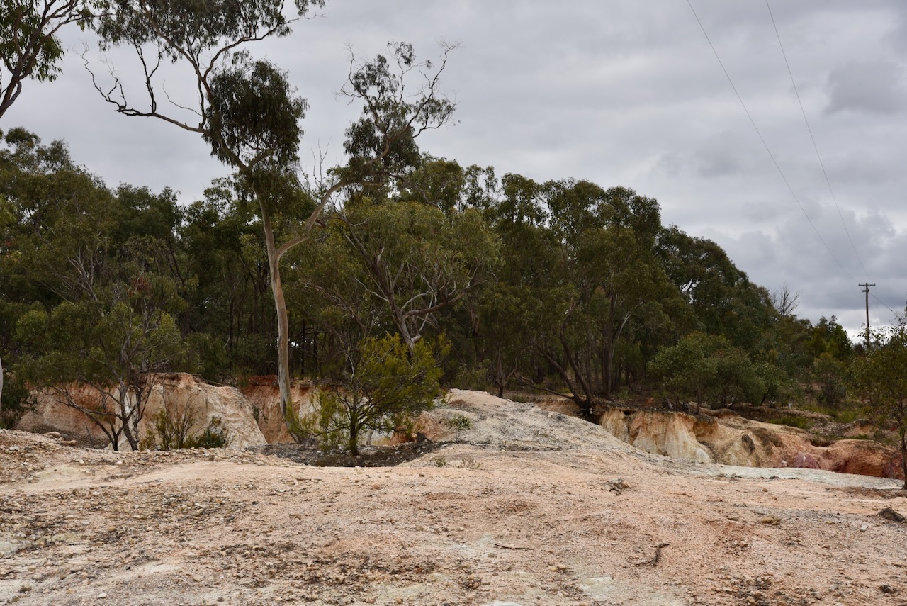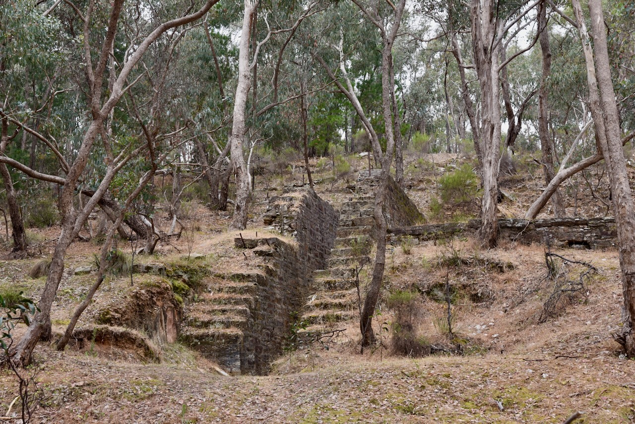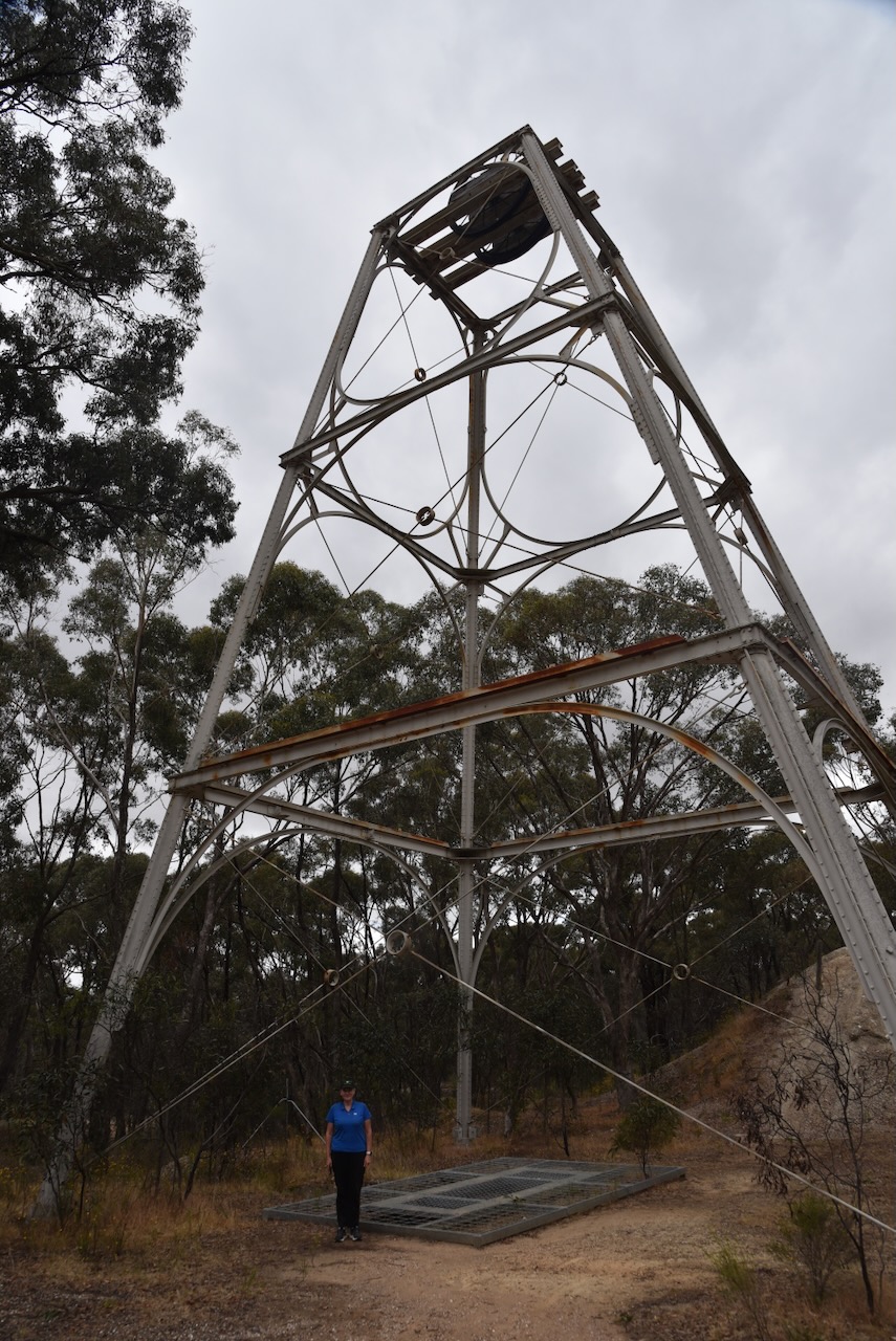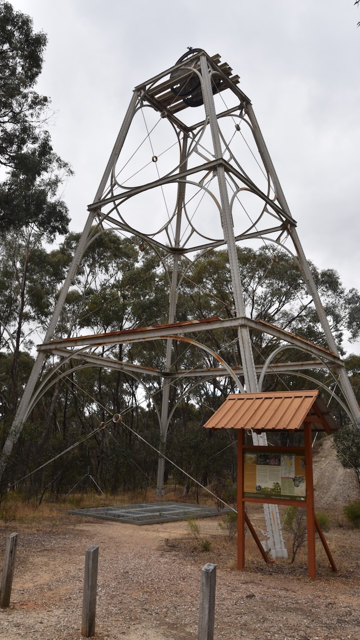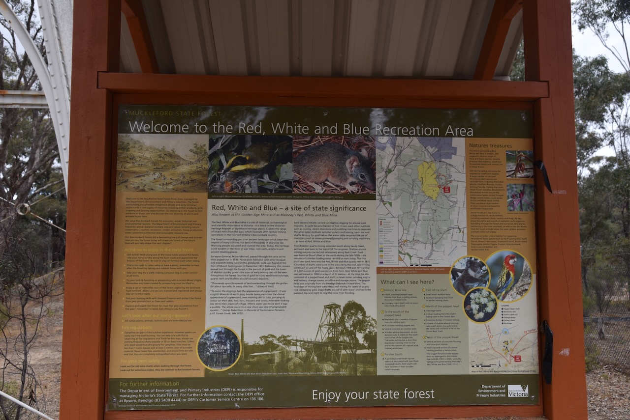 Marija and I then visited the Red, White and Blue mine site at Muckleford. The mine was also known as the Golden Age Mine and Maloney’s Red, White and Blue Mine. The first shaft was sunk here into the Red, White and Blue quartz reef in 1871. Several shafts were sunk in the area along the reef, and mining continued on and off for many years. Between 1909 and 1915 a total of 2,369 ounces of gold was mined here. The Red, White & Blue mine was last mined in 1960 to a depth of 52 metres.