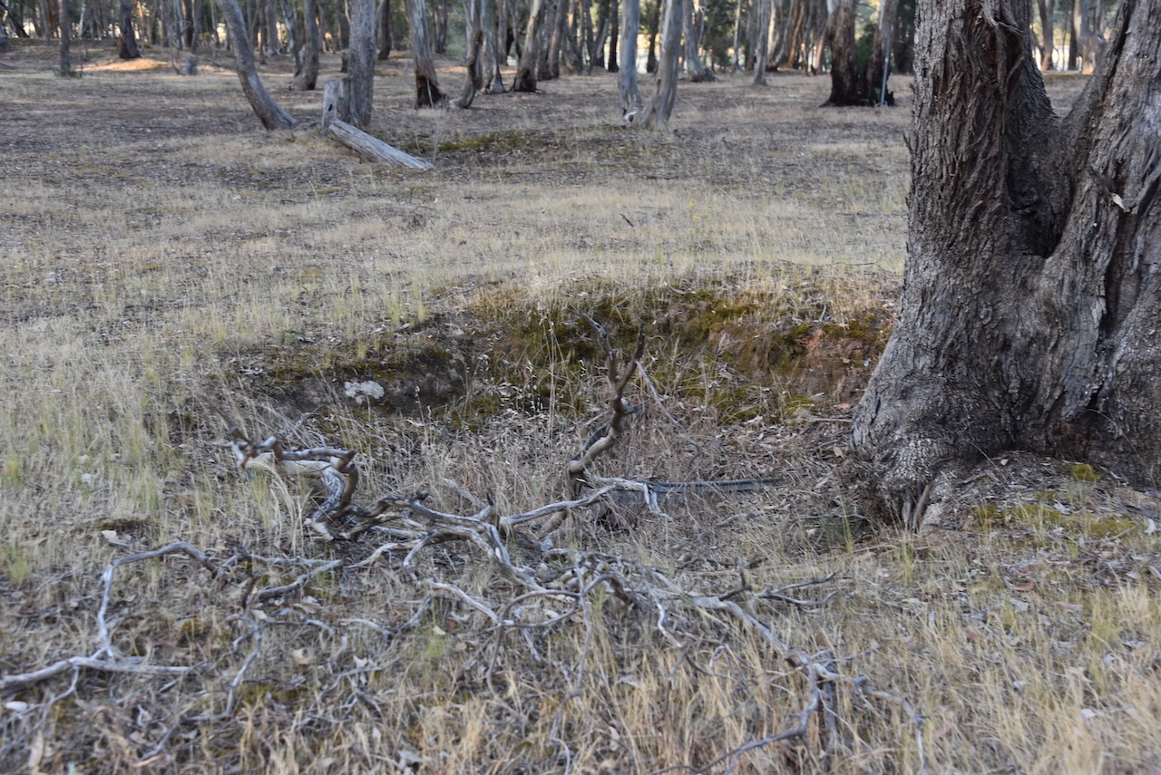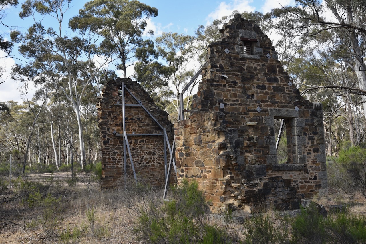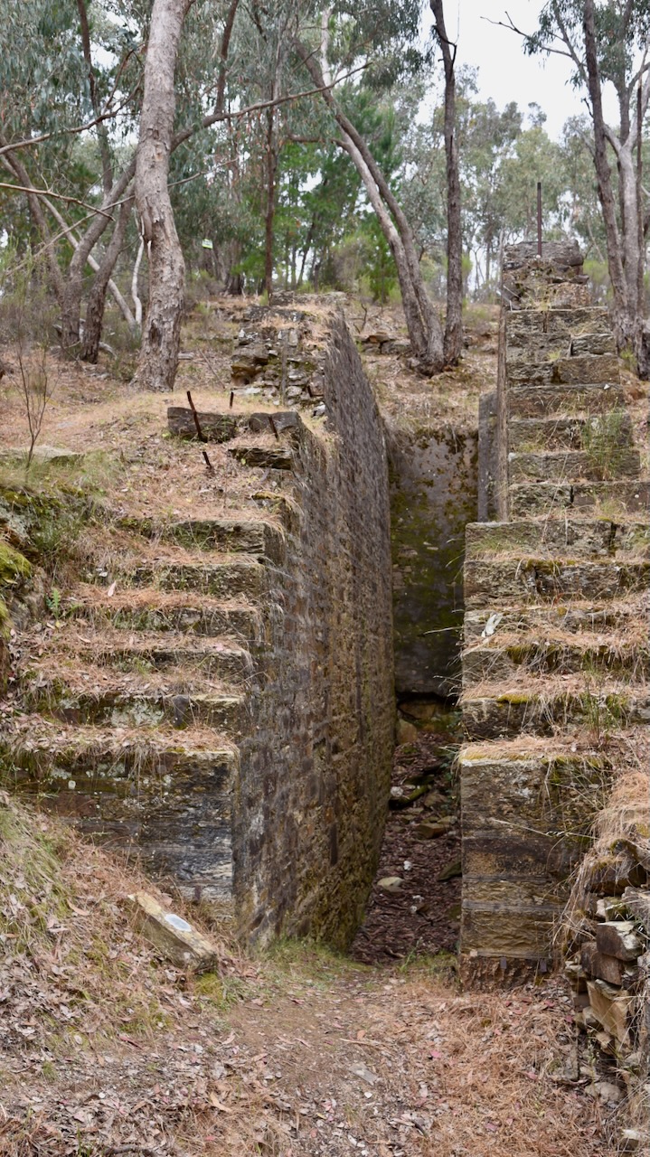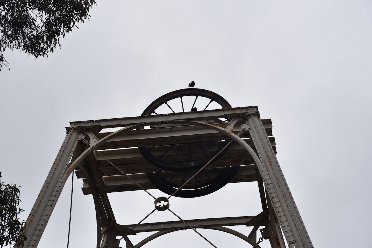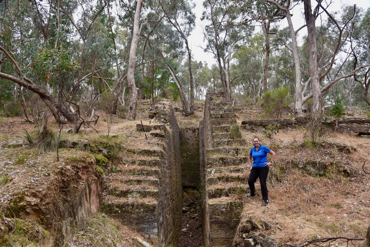 Marija and I then visited the Red, White and Blue mine site at Muckleford. The mine was also known as the Golden Age Mine and Maloney’s Red, White and Blue Mine. The first shaft was sunk here into the Red, White and Blue quartz reef in 1871. Several shafts were sunk in the area along the reef, and mining continued on and off for many years. Between 1909 and 1915 a total of 2,369 ounces of gold was mined here. The Red, White & Blue mine was last mined in 1960 to a depth of 52 metres.
