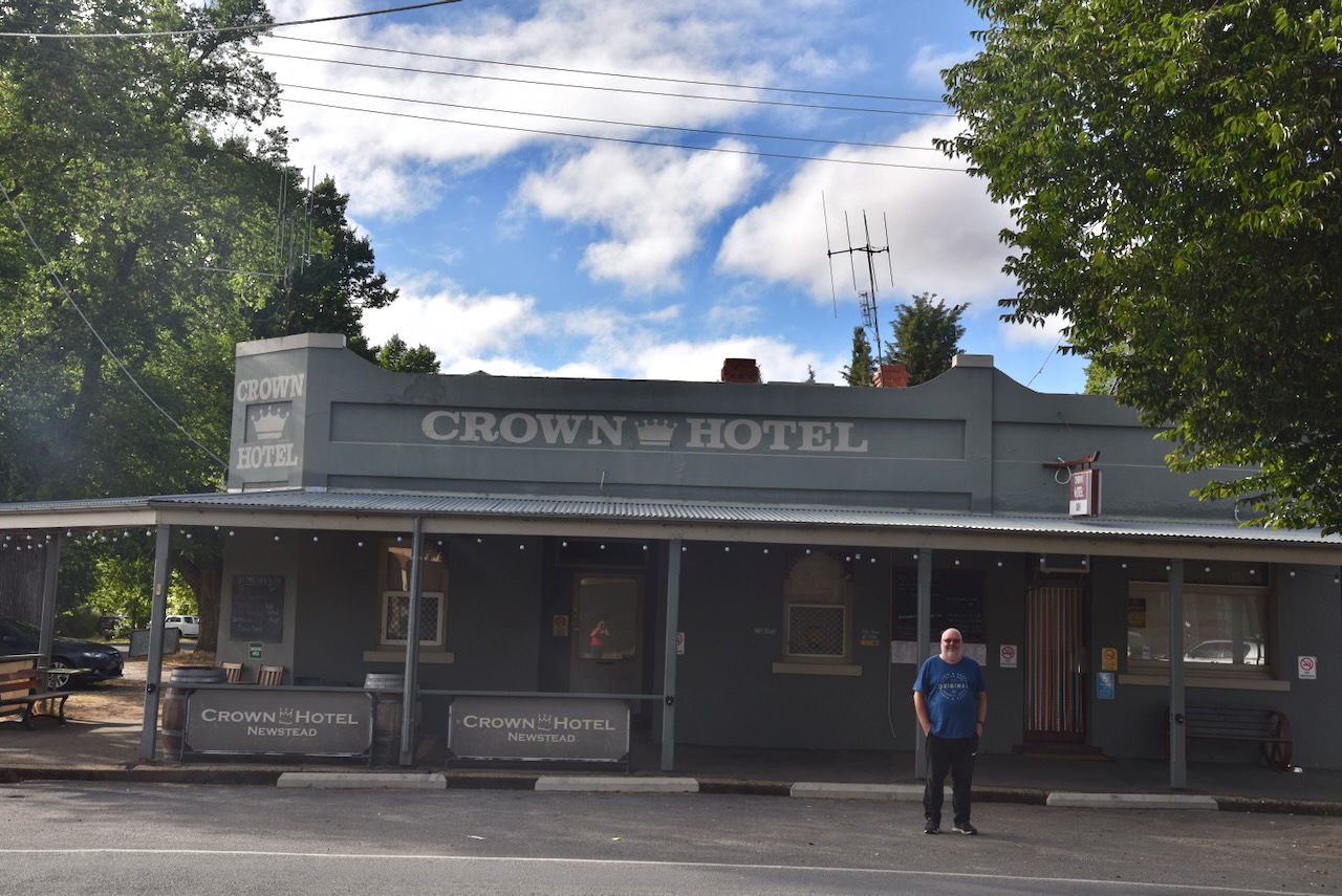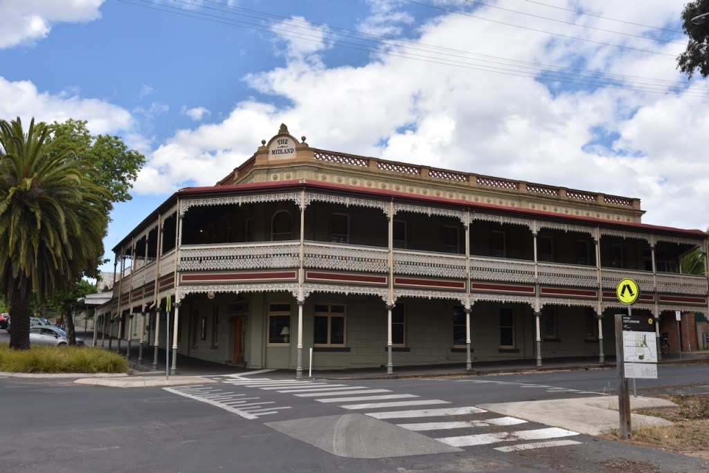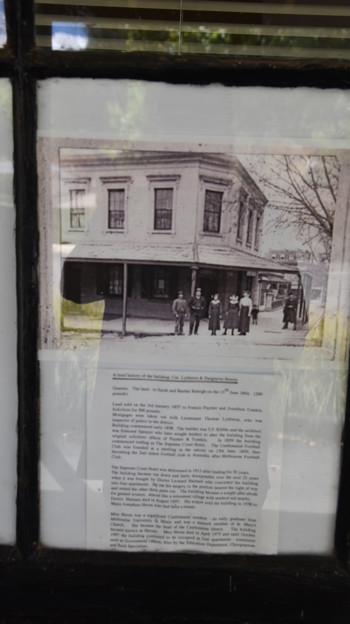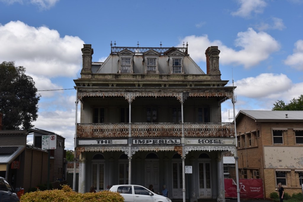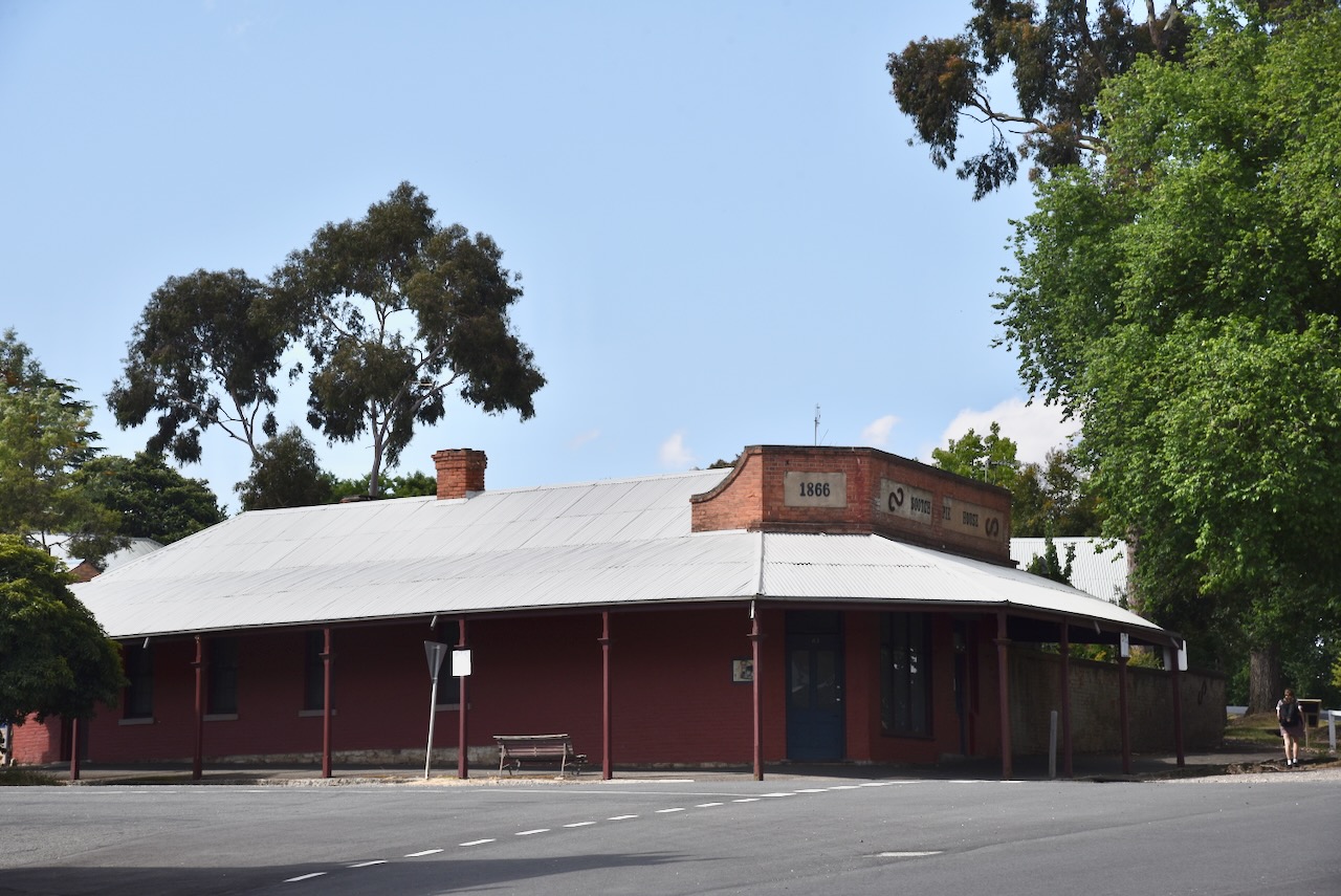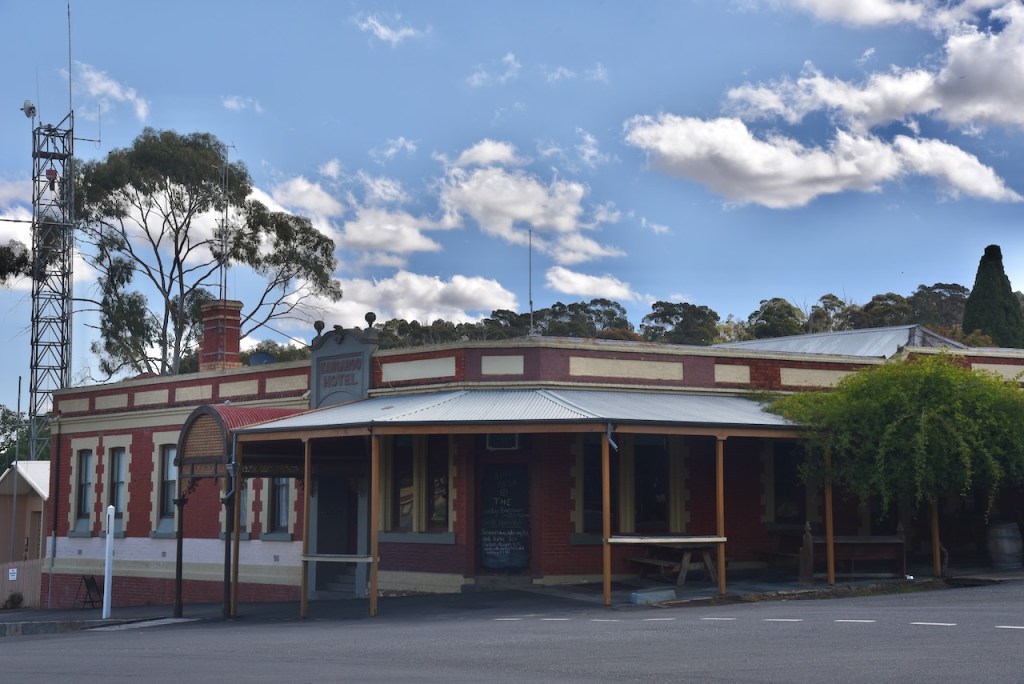 From 1856, a Kangaroo Hotel has operated on this site continuously. It included its own amusement theatre, one of 3 in Maldon during its peak. In 1859 the hotel almost burnt to the ground when somebody set off fireworks during a performance. The brick corner section of the current building dates from 1866. (Maldon Museum 2024)