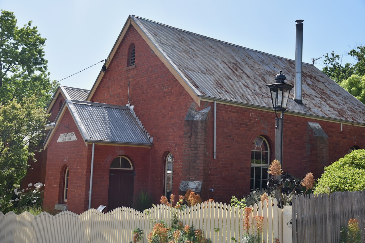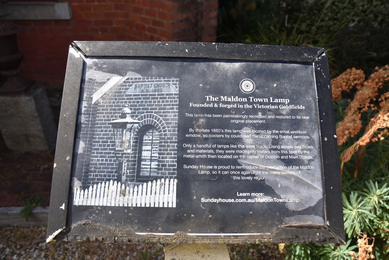 Near the church is the Maldon Town Lamp that was founded and forged in the Victorian goldfields. By the late 1880s, this lamp was located by the small vestibule window so that passersby could read the upcoming Baptist sermons. Only a handful of lamps of this kind were made, using simple processes and materials by a metal smith at Maldon.