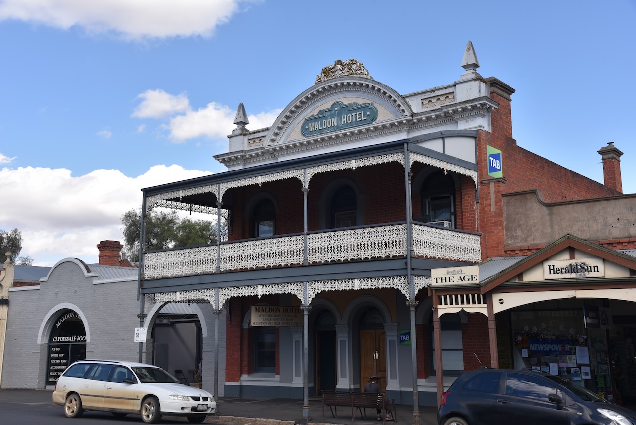 The original Maldon Hotel consisting of a weatherboard structure was built on this site c. 1860. The current building, the hotel and stables, was built in 1909 and was designed by architect Louis Boldini. This was the last grand building to be built in Maodon before the town’s decline. (Maldon Museum 2024)