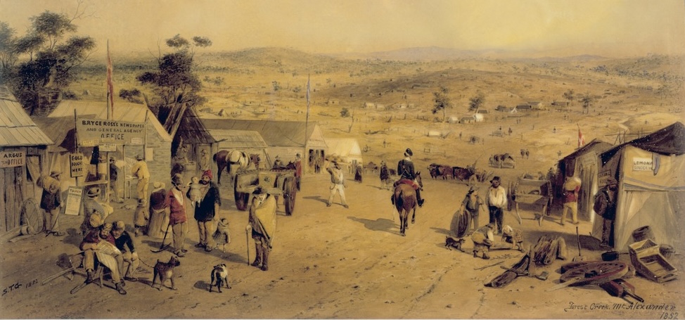 The road follows up the course of Long Gully, where the diggings were first opened, for a couple of miles, and is lined on either side by an almost continuous row of stores, refreshment tents, eating houses, doctors’ tents, apothecaries’ shops, and, in fact, shops of every description.” (Tarrengower Diggins 1854)