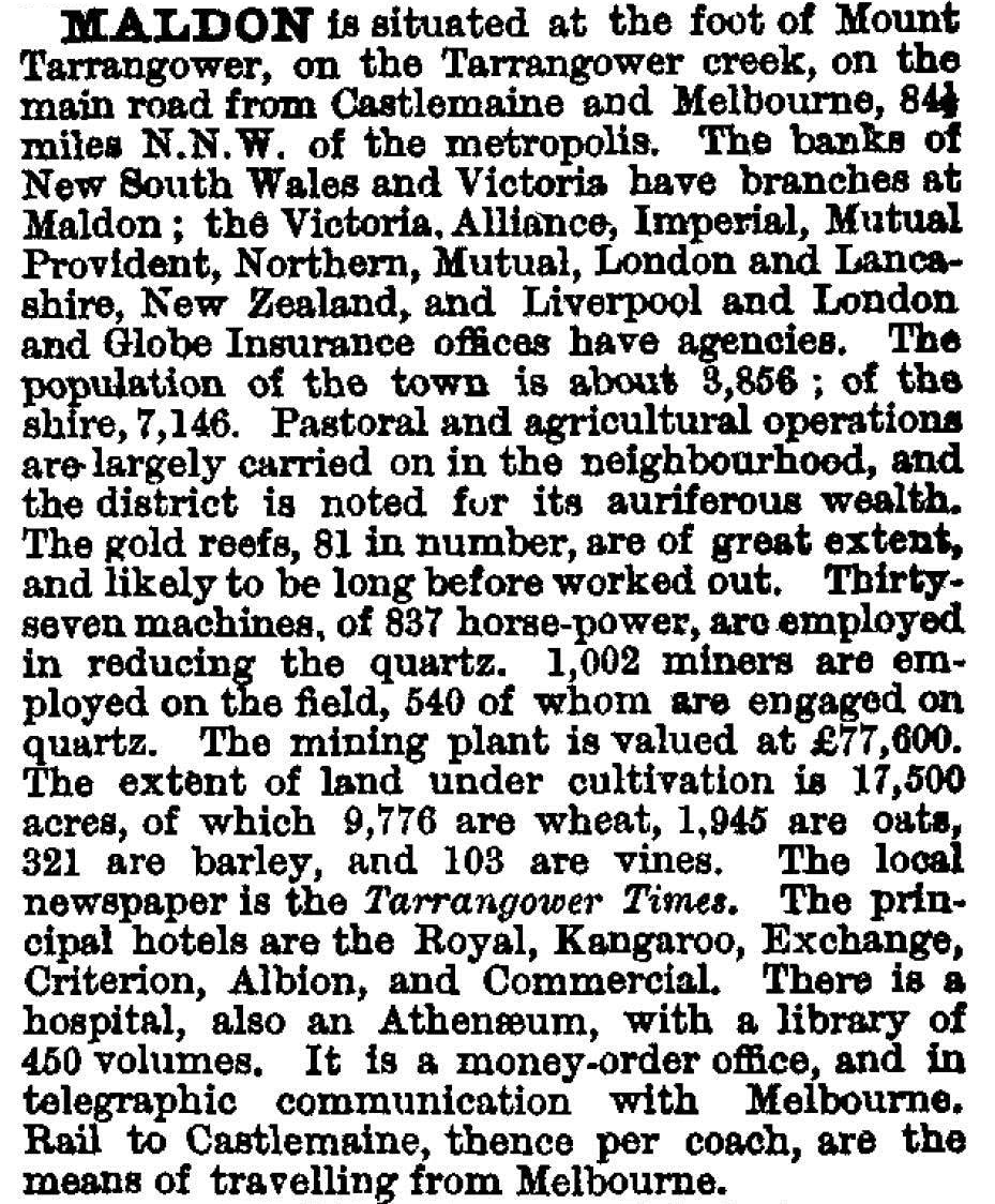 Maldon’s population peaked during the 1870s, with the town having a population of 3,817 [people in 1871. The Australian Handbook in 1875 described Maldon as follows…..