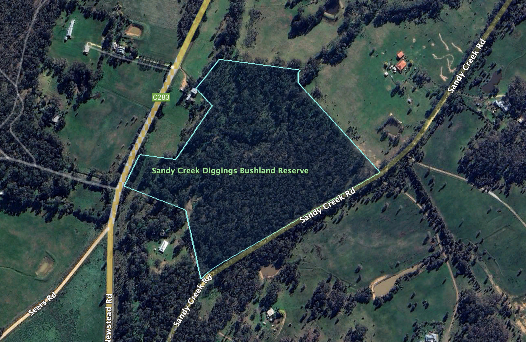 Above:- Map showing the location of the Sandy Creek Diggings Bushland Reserve. Map c/o Google Maps.
