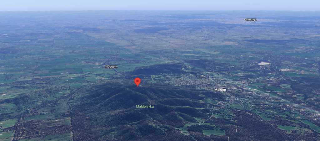 The summit is located about 4 km (by road) west of Maldon and about 148 km northwest of the city of Melbourne.