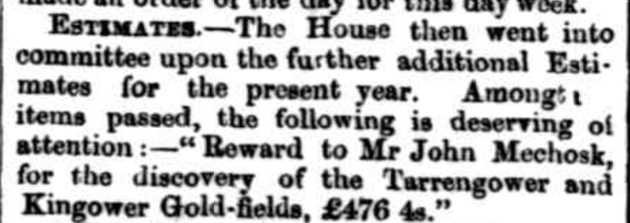 In 1857 Mechosk was issued with a reward of £476 for his discovery of the Tarrengower and Kingower goldfields. (Victorian Places 2024)