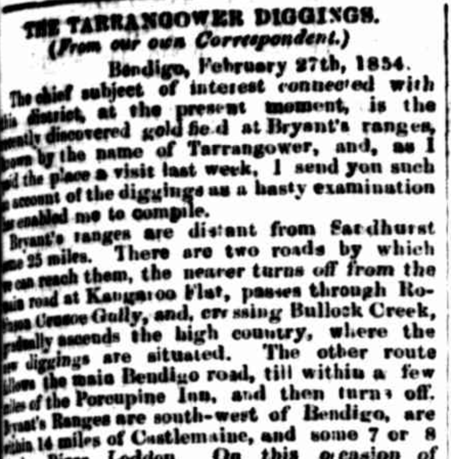 In December 1853, a Polish immigrant John Mechosk, discovered gold near the foot of Mount Tarrengower. As a result, a gold rush occurred in 1854 with the goldfield named Tarrengower Fields. Just one month after the discovery of gold, the Chief Commissioner for Goldfields reported that 3,000 miners had arrived at the diggings.