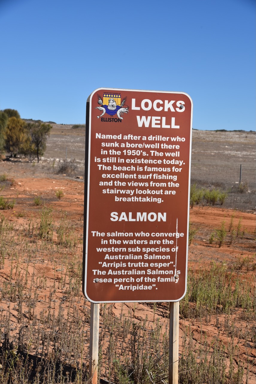 My first stop along Flinders Highway after leaving Elliston, was Locks Well. This is one of the most reliable locations in South Australia for catching Australian salmon and is located about 16km south of Elliston. Locks Well Roads leads to a ‘top’ car park for caravans and motorhomes. There is a lower car park for other vehicles. There is a viewing platform which offers spectacular views along the coast. There is a 60-metre drop from the car park down to the beach, which is accessible via a 120-metre wooden staircase. Locks Well takes its name after a driller who sunk a bore/well at this location during the 1950s. He went down to a depth of 50 metres but did not find water. (Elliston 2024)
