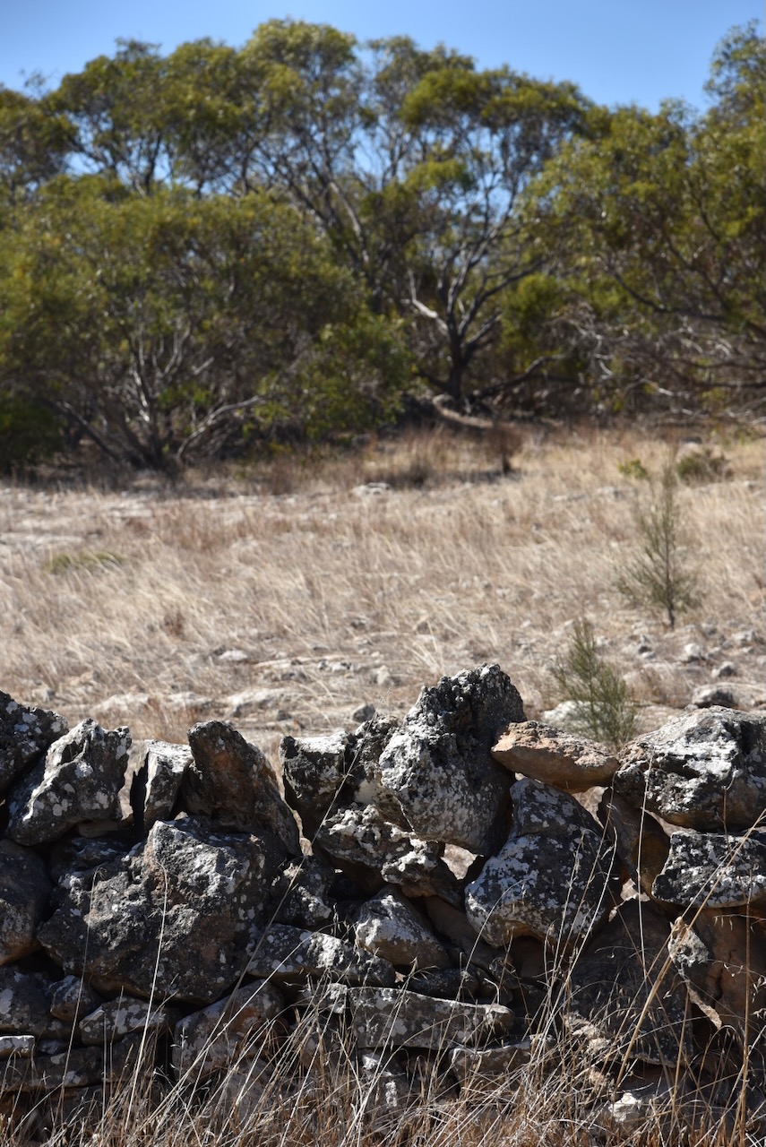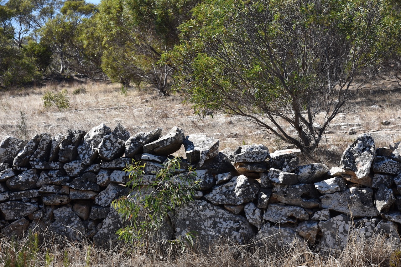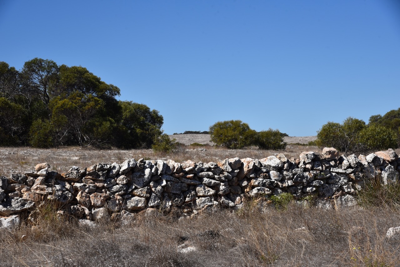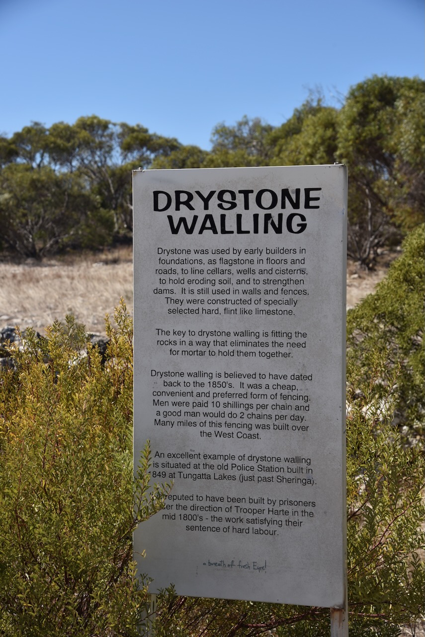 I continued south on Flinders Highway and then stopped to have a look at the drystone wall near Tungatta Lakes, about 22 km south of Elliston. Drystone was used by early builders in foundations, as flagstone in floors and roads, to line cellars, wells and cisterns, to hold eroding soil, and to strengthen dams. It is still used in walls and fences. This particular wall is believed to have been built by prisoners under the direction of Police Trooper Harte who was stationed at the nearby Tungatta Police Station. (Aussie Towns 2024)