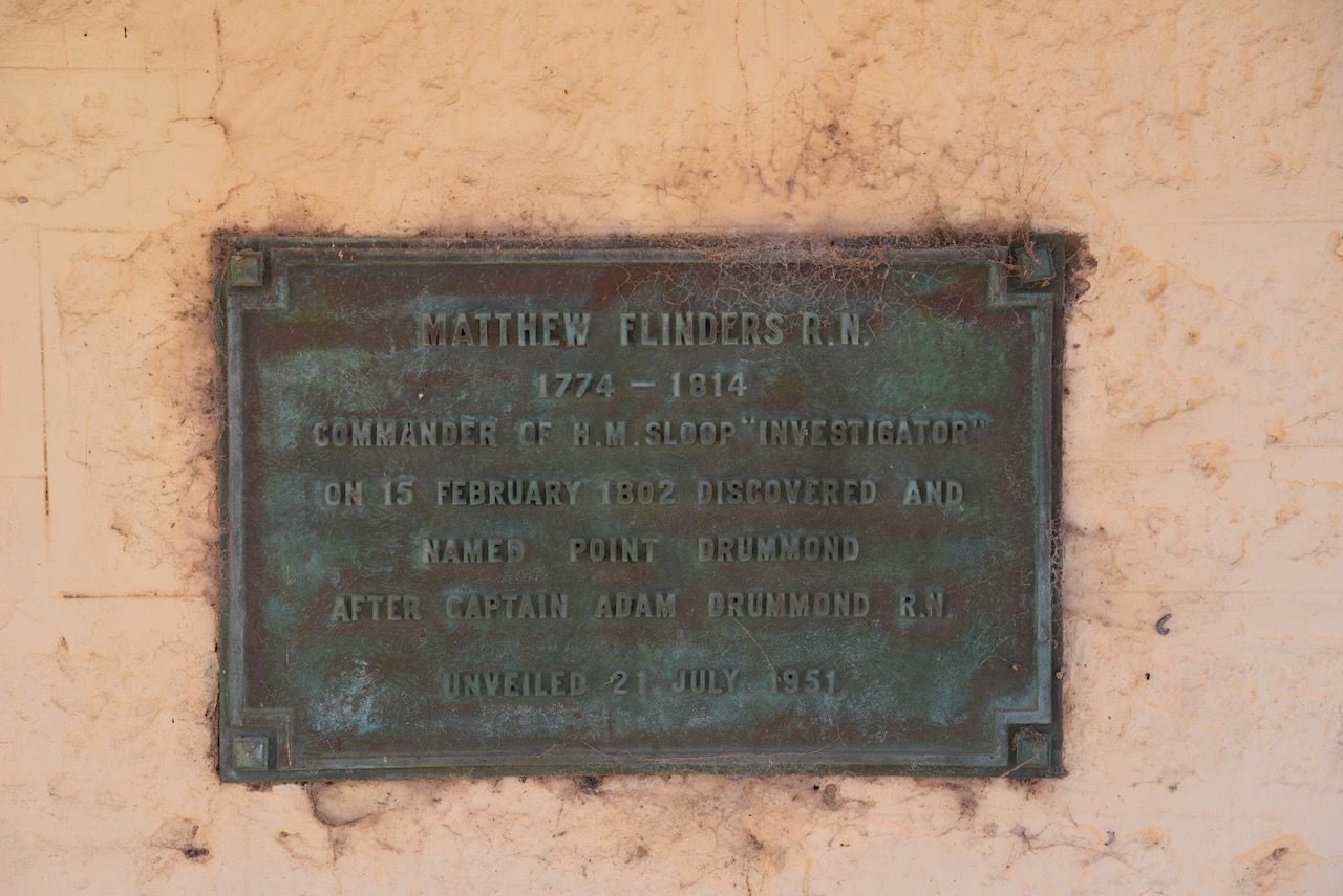 “Matthew Flinders R.N. 1774-1814. Commander of H.M. Sloop Investigator on 15 February 1802 discovered and named Point Dummond after Captain Adam Drummond R.N.”