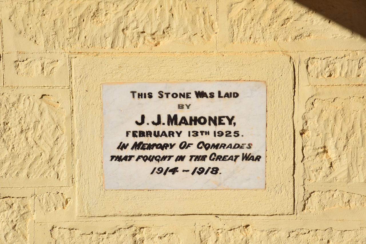 Not much remains here nowadays. One of the surviving buildings is the Soldiers Memorial Hall. The foundation stone was laid by J.J. Mahoney on the 13th day of February 1925. The hall was erected in ‘memory of comrades that fought in the Great War 1914-1918’.