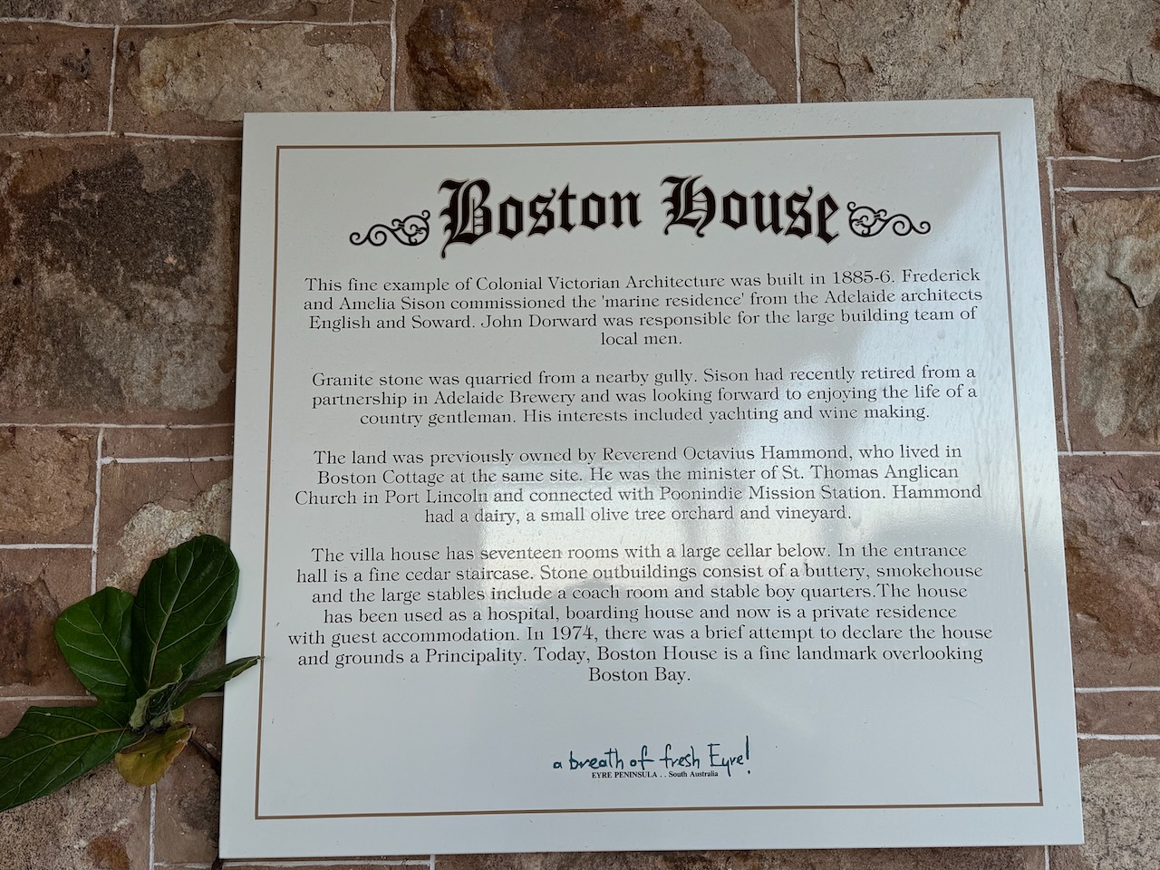 Boston House was built in 1885-1886. Frederick Samuel Sison (b. 1832. d. 1891) commissioned the marine residence from the Adelaide architects English and Soward. Sison had recently retired from a partnership in Adelaide Brewery and was looking forward to the life of a country gentleman. The granite stone was quarried from a nearby gully. The house has seventeen rooms with a large cellar. The entrance hall has a fine cedar stairhouse. There are several stone outbuildings including a buttery, smokehouse and stables. The house has been used as a hospital and boarding house.
