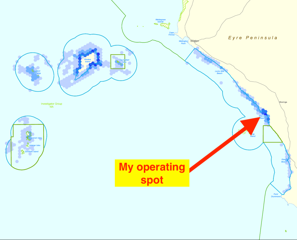 Above:- Map of the Investigator Marine Park, showing my operating spot at Sheringa Beach. Map c/o Dept for Environment & Water SA.