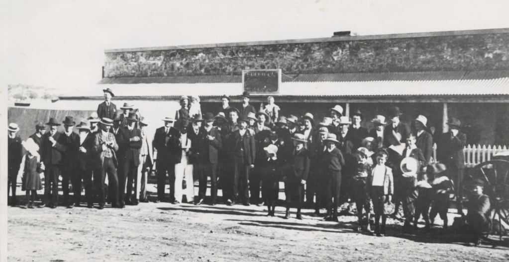 Above:- Group of people standing in front of the Sheringa Boarding House, taken on the occasion of their annual sports event.. Image c/o State Library South Australia.