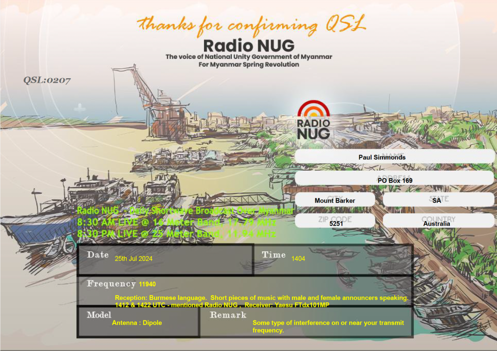 QSL card from Radio NUG for my reception of their station on 25th July 2024 on 11940 kHz.
