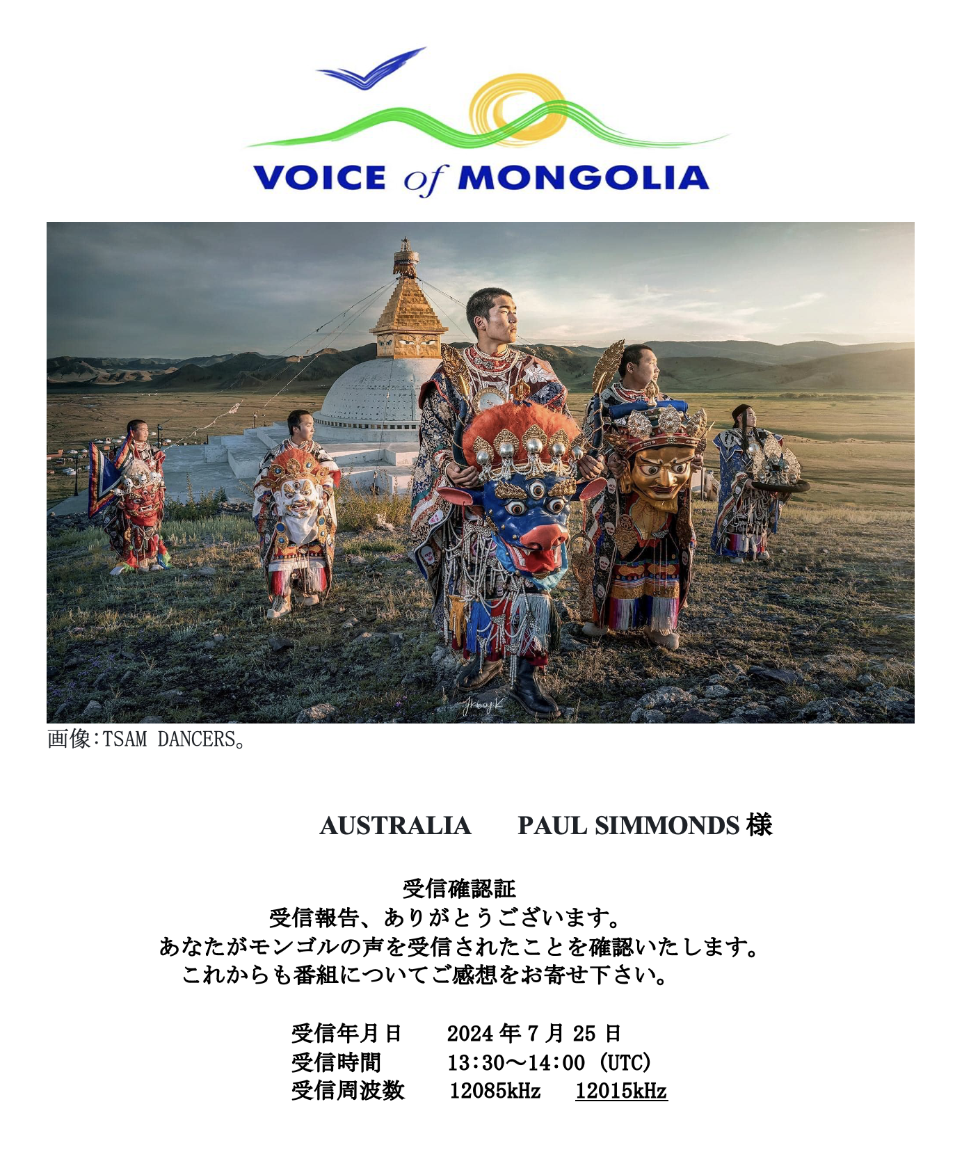 QSL card from the Voice of Mongolia for my reception of their station on 25th July 2024 on 12015 kHz.