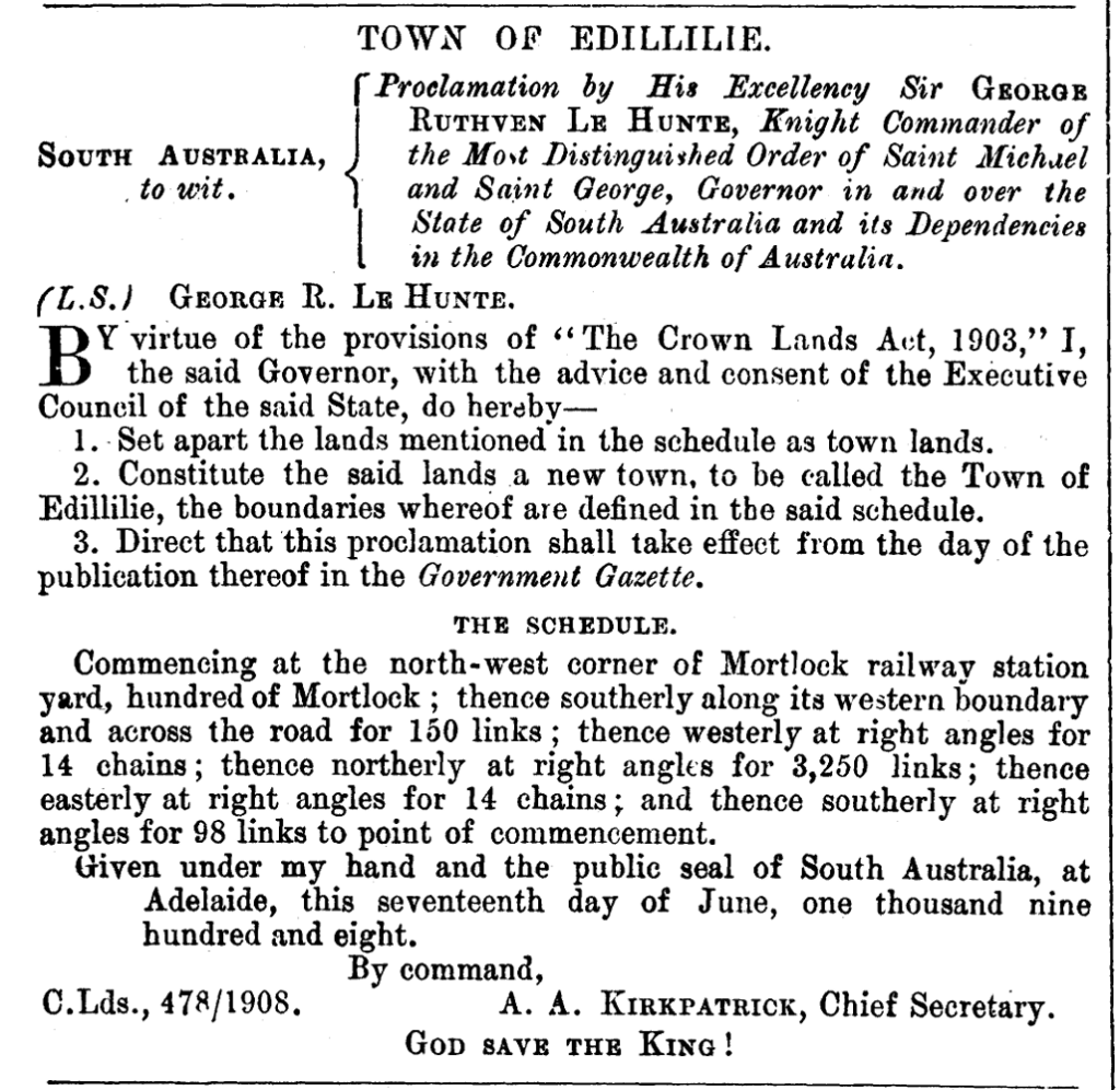 Just one week after the proclamation of the town, the resident Engineer and Superintendent of Railways Port Lincoln recommended that the station name be altered from Mortlock to Edilillie. It is believed this was to conform with the proclaimed name of the township. This was approved by the Railways Commissioner Mr Alan G. Pendleton and the name change came into effect in c. November 1908. (Pt Lincoln Times 1956)