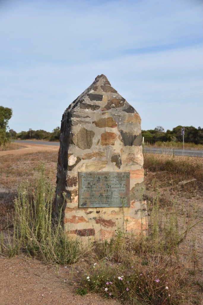 After breakfast, I headed out of Port Lincoln. My first stop was the monument for Captain Matthew Flinders on Proper Bay Road. The cairn commemorates Flinders and his ship’s company’s first visit for water in 1802. The cairn was unveiled in 1939 during the Port Lincoln Centenary.