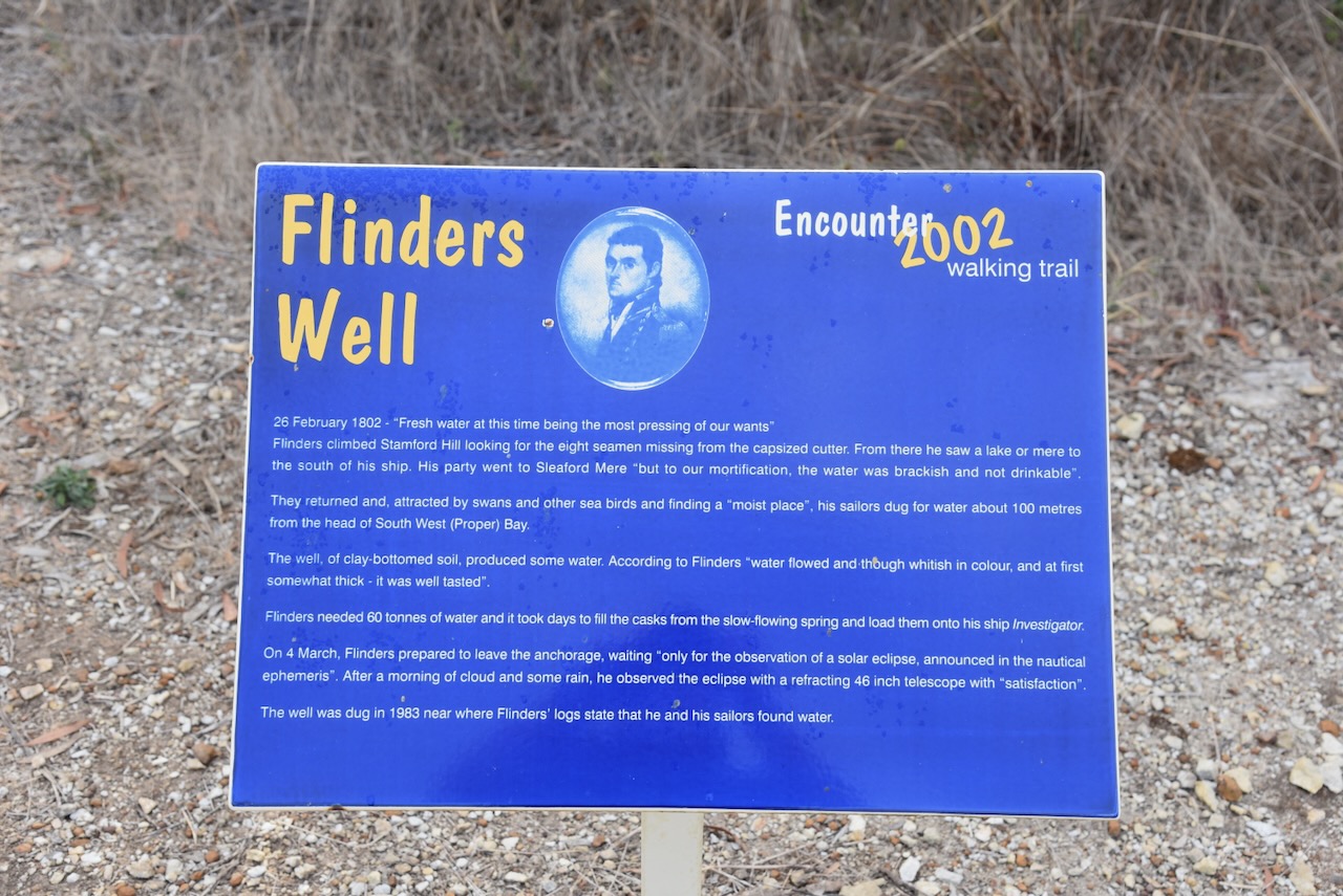 Flinders Well is located in close proximity. On the 26th day of February 1802, FLinders wrote “Fresh water at this time being the most pressing or our wants”. Flinders climbed Stamford Hill looking for the eight seamen missing from the capsized cutter. From there he saw a lake or mere to the south of his ship. His party went to Sleaford Mere ‘but to our mortification, the after was brackish and not drinkable’. They returned and, attracted by swans and other sea birds and finding a ‘moist place’, his sailors dug for water about 100 metres from the head of South West (Proper) Bay. The well, of clay-bottomed soil, produced some water.