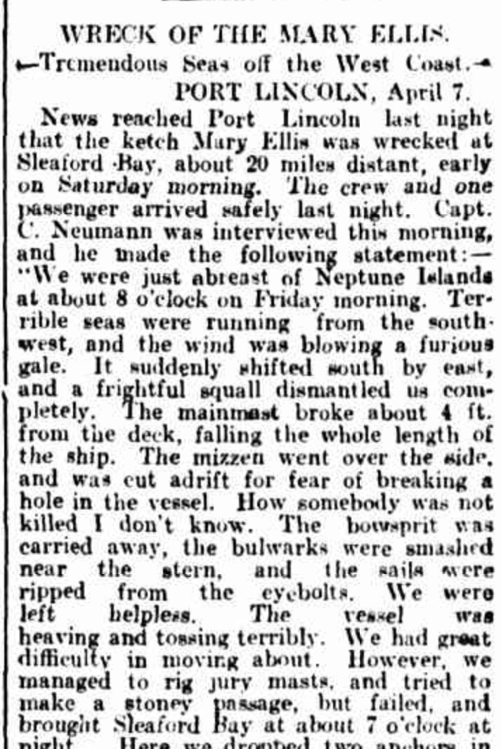The Mary Ellis was a trading ketch that worked in South Australian waters from 1899 to 1907. It undertook voyages to the West Coast and regularly called into ports such as Venus Bay, Sceale Bay, Streaky Bay, Denial Bay, Fowlers Bay, Elliston and Point Sinclair. (Aust Govt 2024)