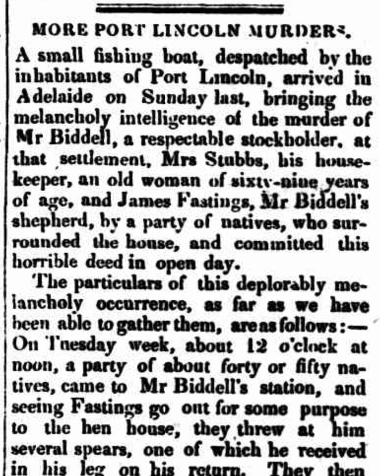 There had been ongoing violence in the Port Lincoln district. In April 1842 Mr Rolles Biddell, his housekeeper Mrs. Elizabeth Stubbs, and his shepherd James Fastings were murdered by local aboriginal people.