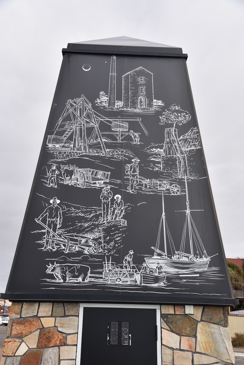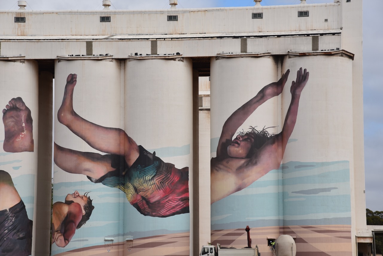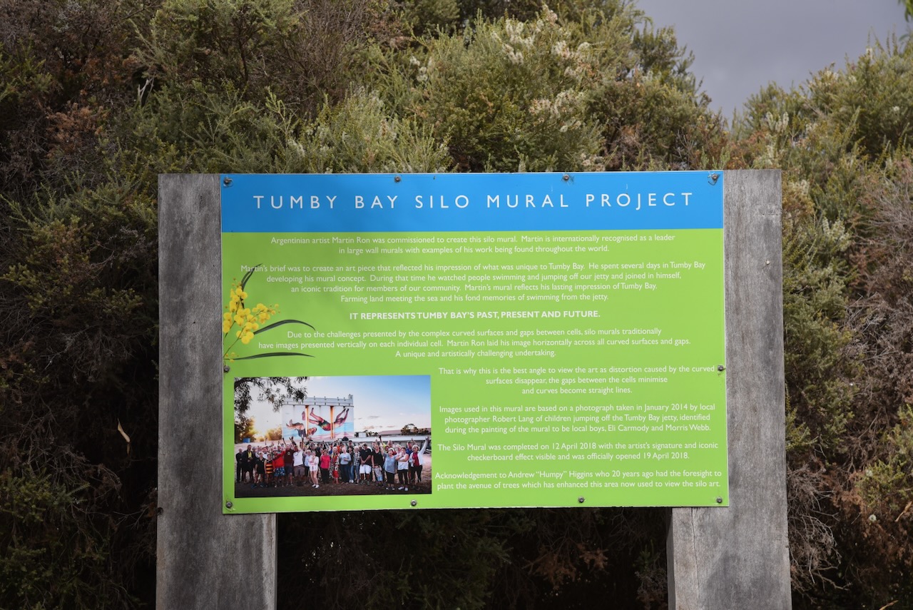 The Tumby Bay silos are part of the Australian SIlo Art Trail. They were their third silos to be painted in South Australia and were completed on the 13th day of April 1908. The silo art depicts two boys jumping off the Tumby Bay jetty. The silo art is the work of Argentinian-born artist Martin Ron and his assistant Matt Gorrick whose inspiration came from seeing people dive off the jetty into the ocean. (Australian Silo Art 2024) (YouTube 2024)