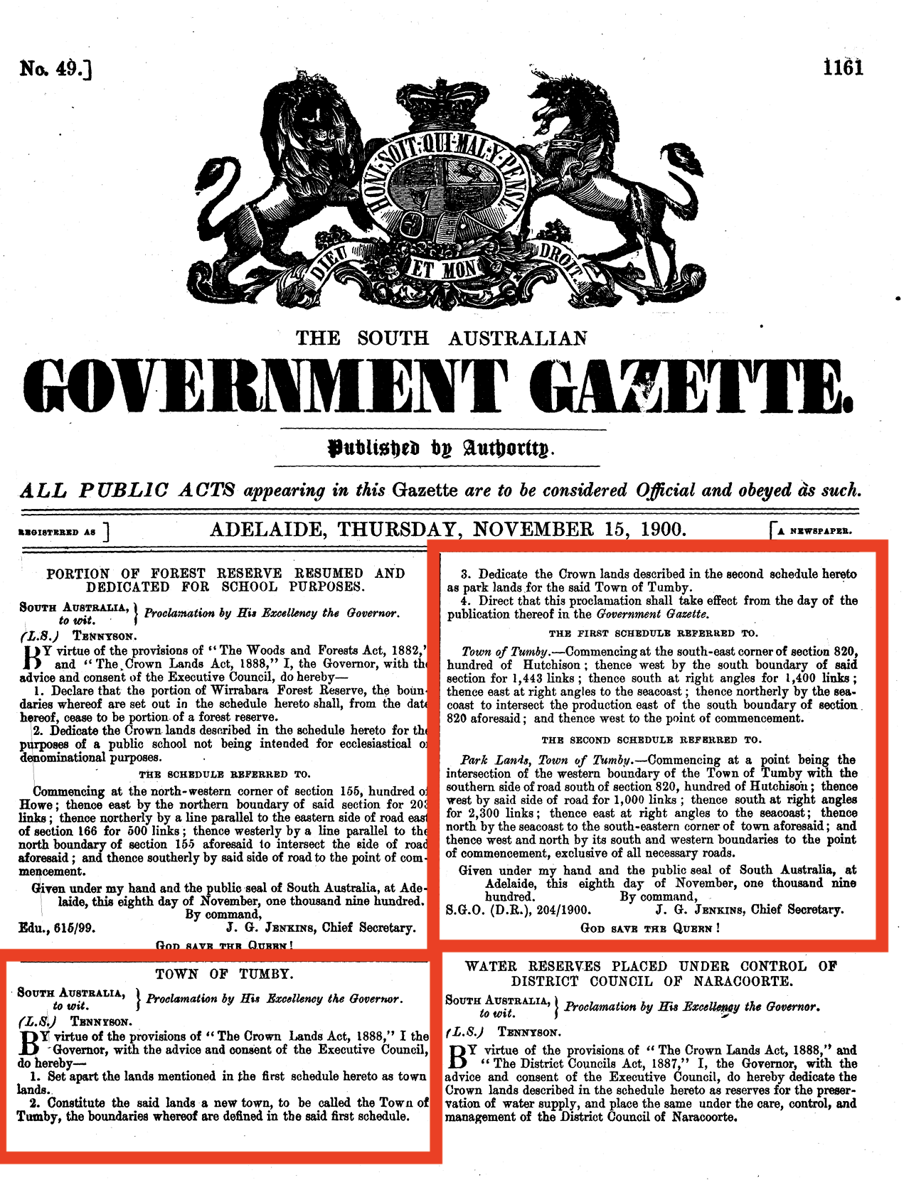 Above:- The proclamation of the town of Tumby in the SA Govt Gazette, Thu Nov 15, 1900.