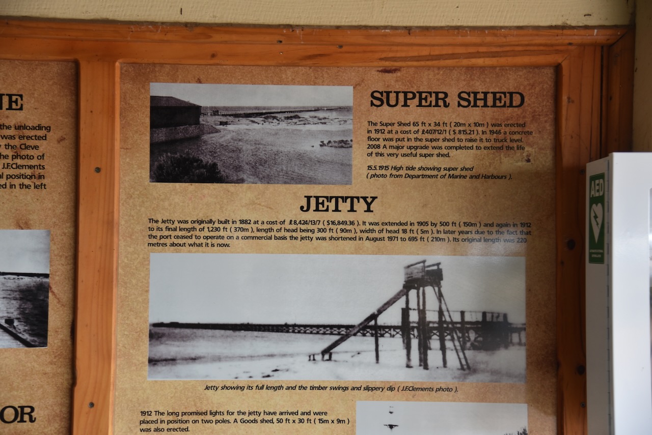 The Arno Bay Super Shed was built in 1912. It ceased being used for bagged grain/super in 1964. It now contains various tourist information and a large amount of history about Arno Bay and the district.